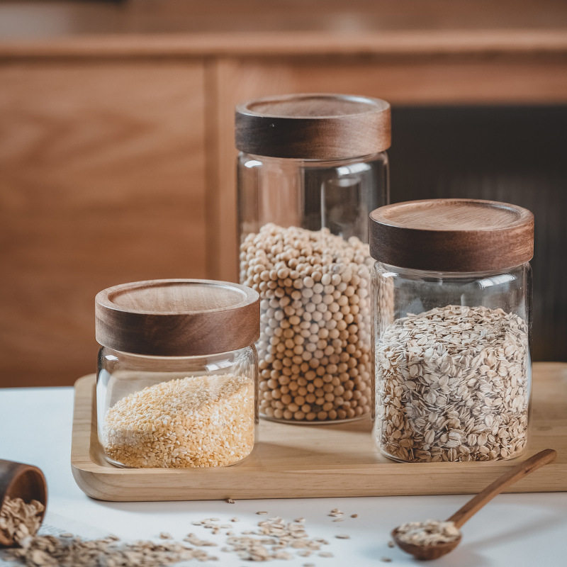直径10cm大号杂粮咖啡豆螺纹储物罐相思木盖玻璃茶叶密封罐泡酒罐