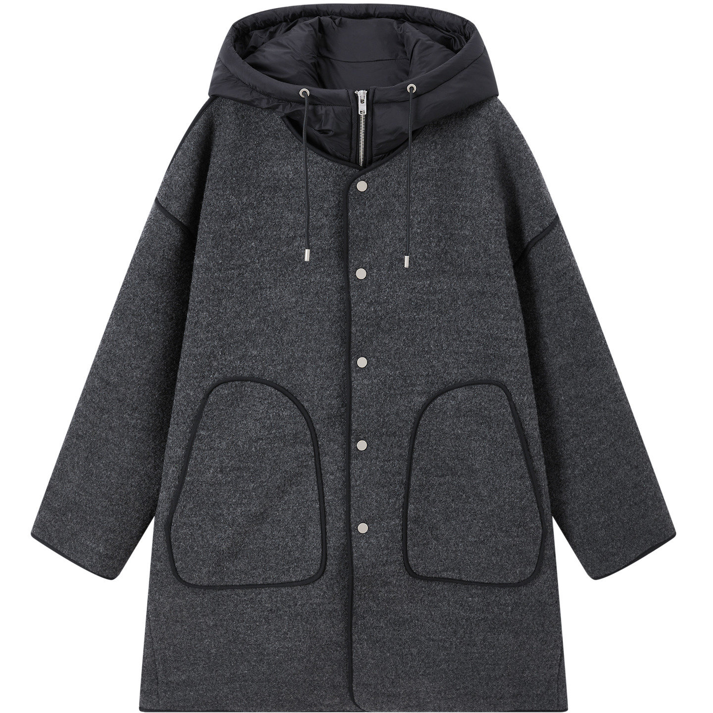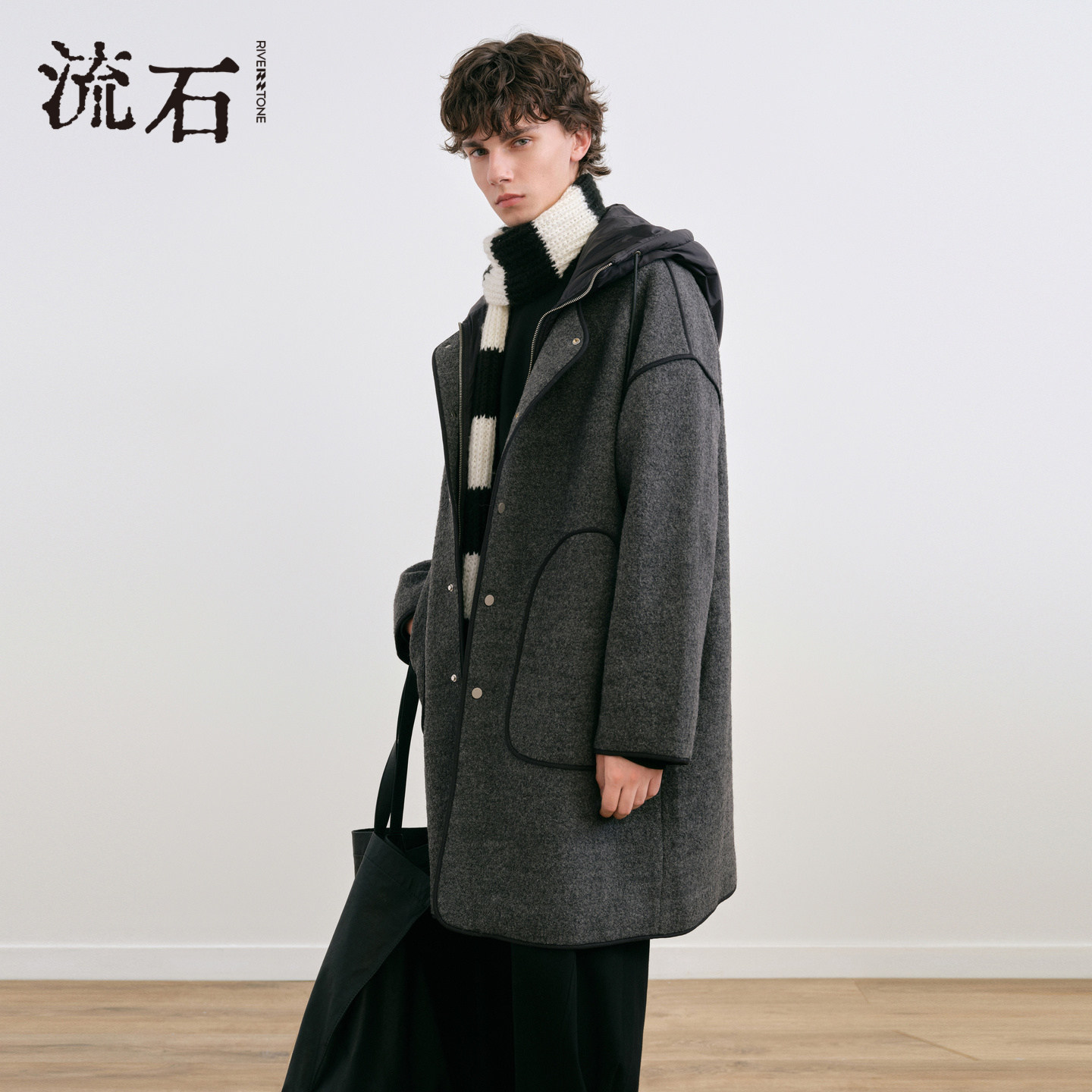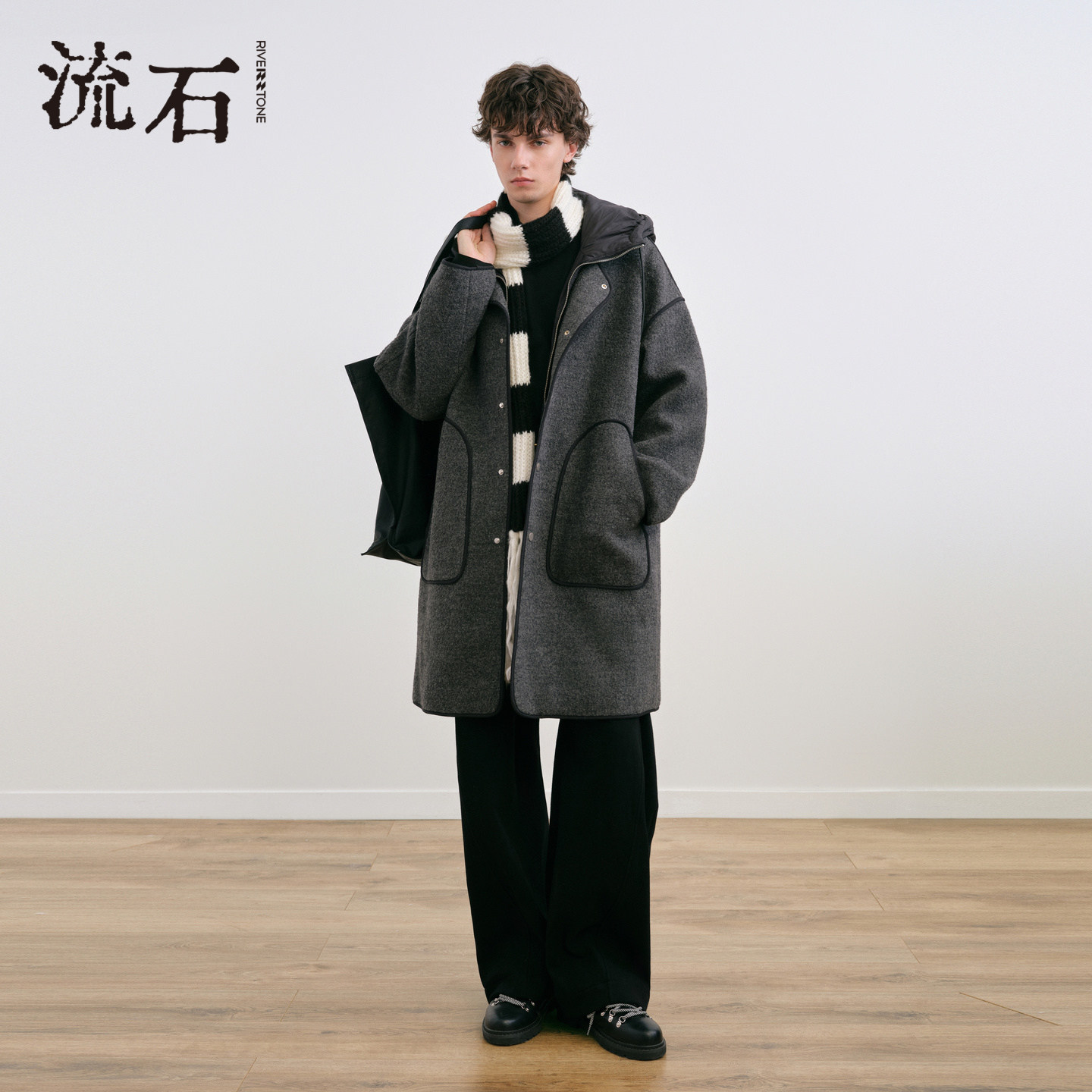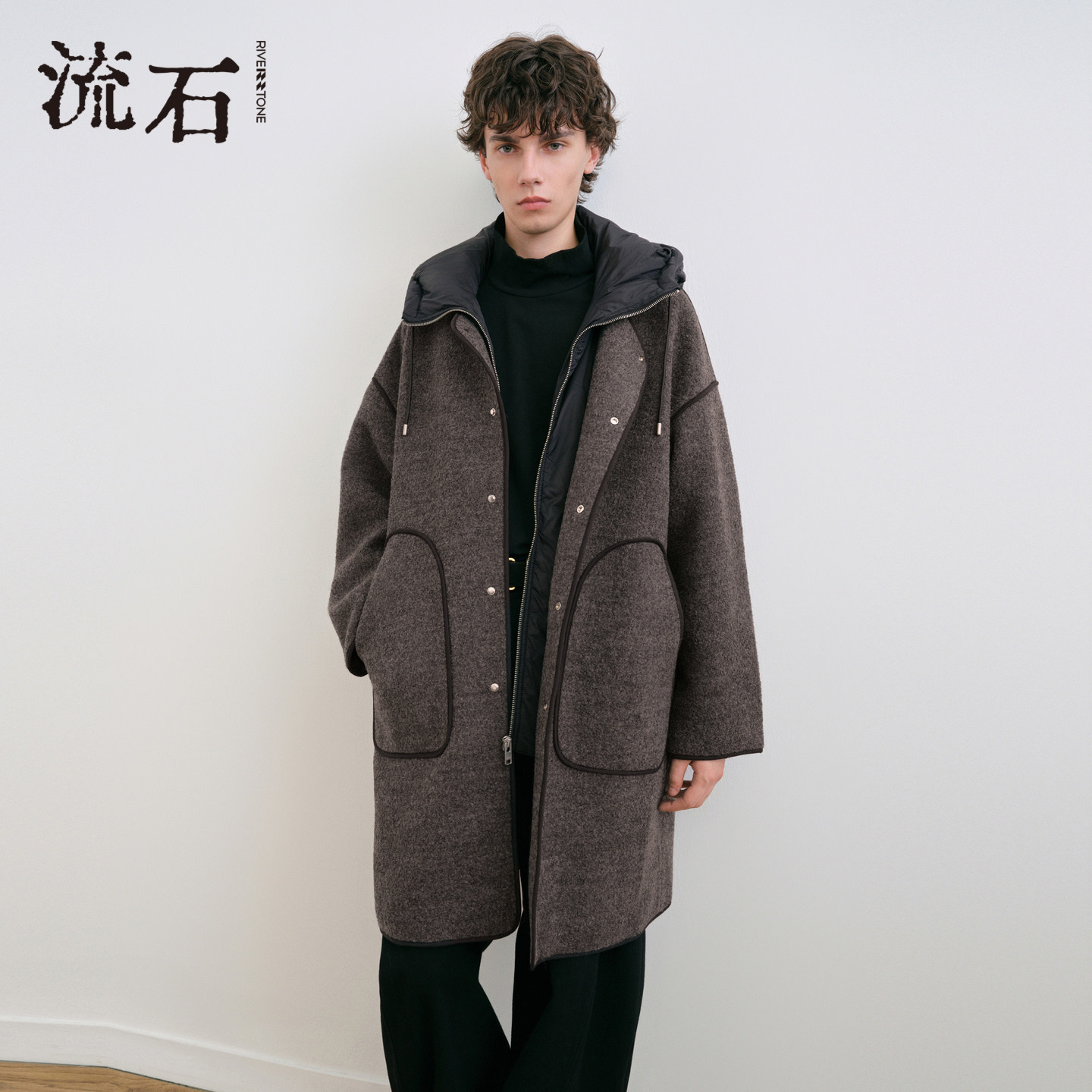 流石男装毛呢中长款大衣2025年冬季新款男士全羊毛假两件连帽外套