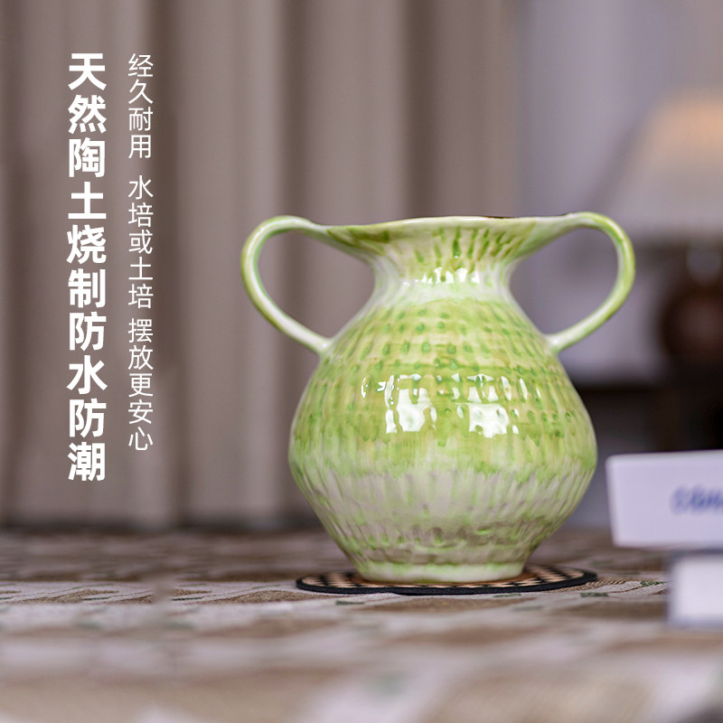 景德镇陶瓷花瓶新款手捏高级感双耳青绿高端民宿酒店台面摆件花器