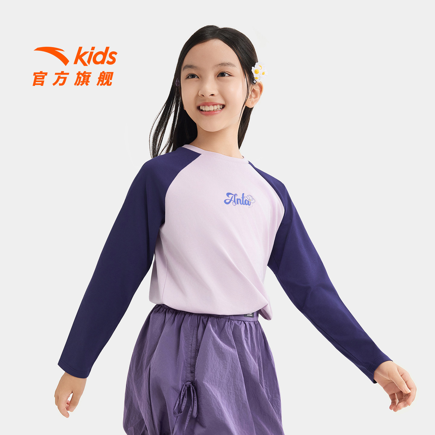 安踏儿童女童针织长袖衫2026年春季新款舒适亲肤百搭中大童长T恤