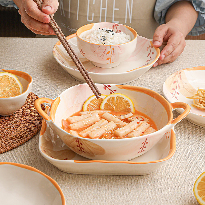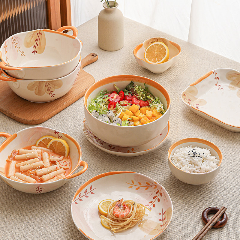奶油风陶瓷碗家用卡通菜盘子可爱米饭碗汤碗釉下彩儿童餐具耐高温