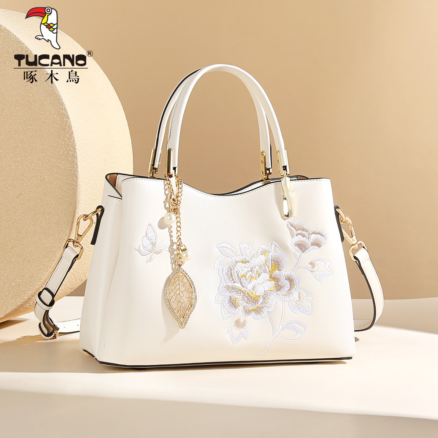 啄木鸟真皮女包2025新款秋冬季高级感国风中式刺绣单肩手提包斜挎