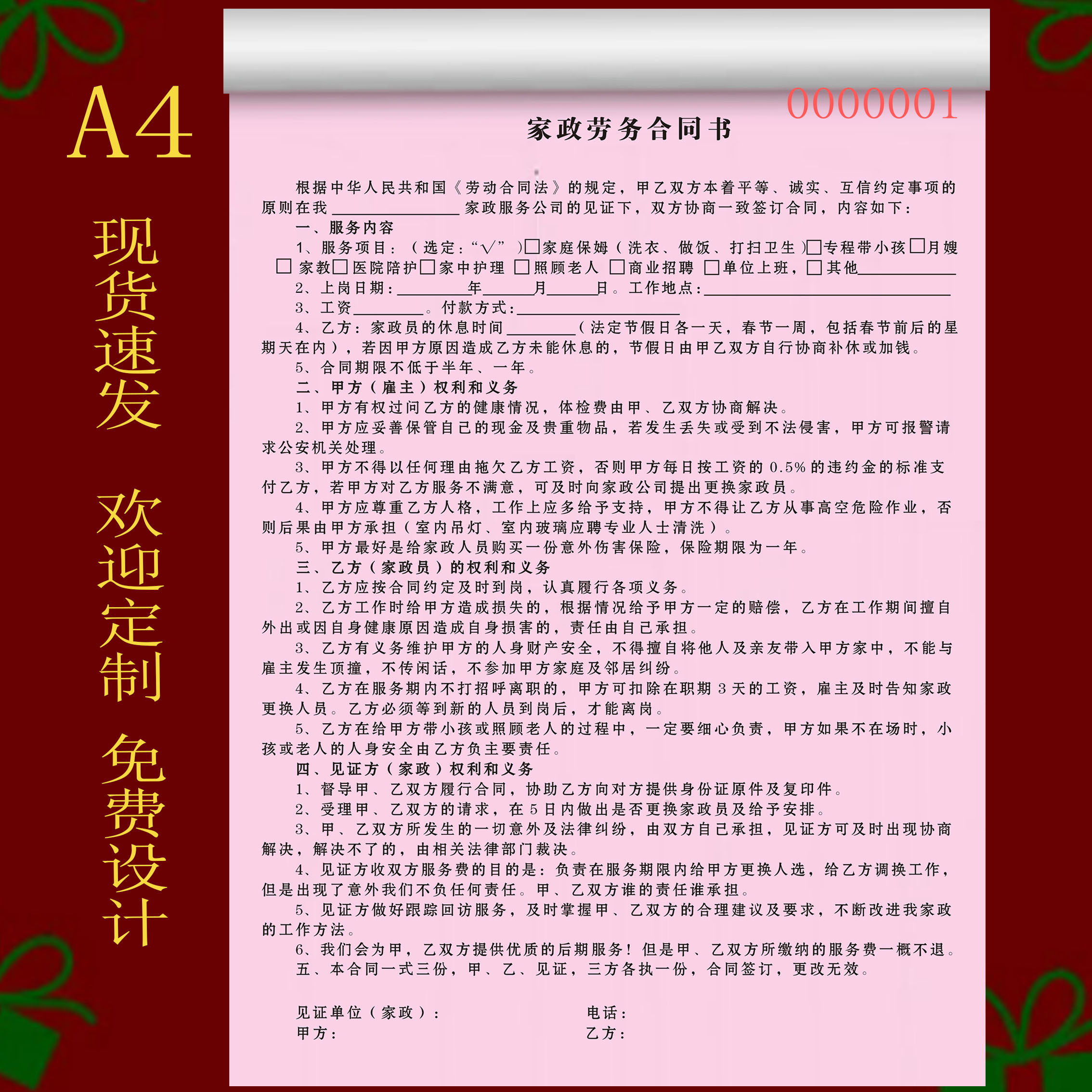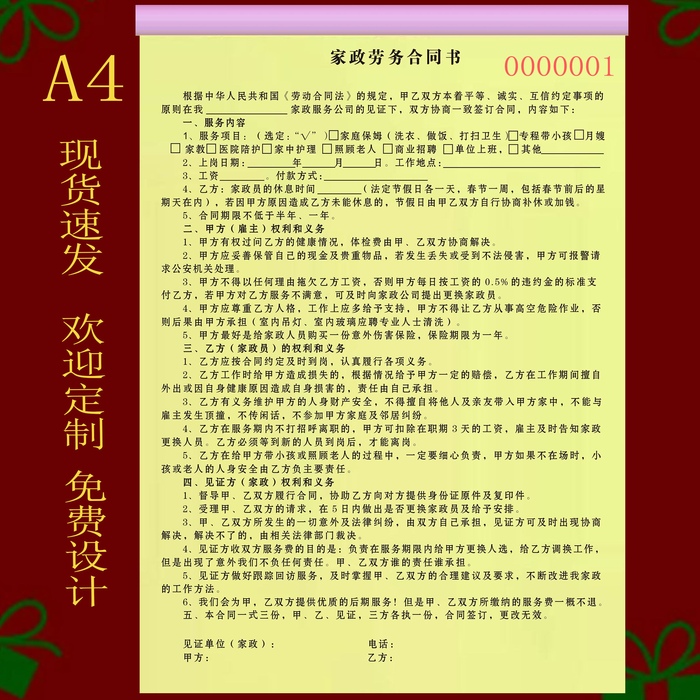 家政服务合同三联家政服务单通用中介保姆月嫂保洁施工派工单定制