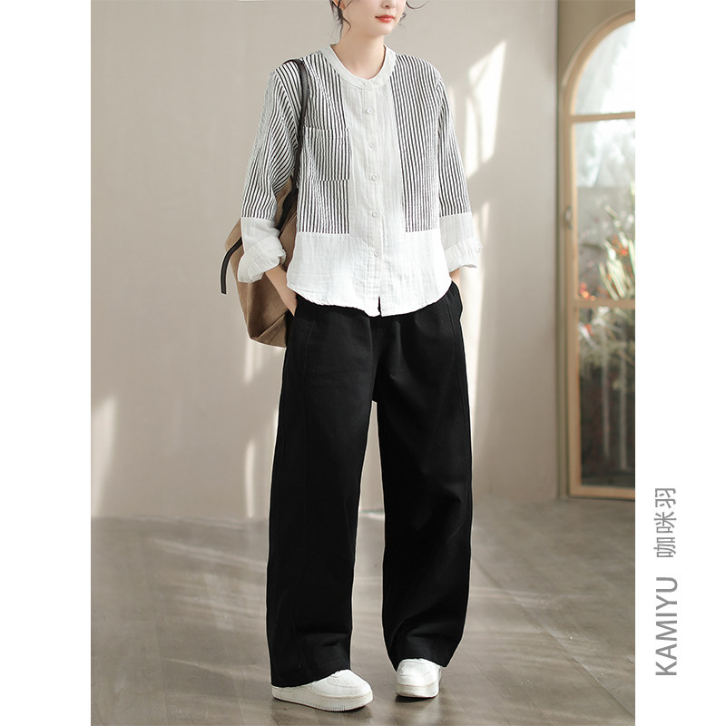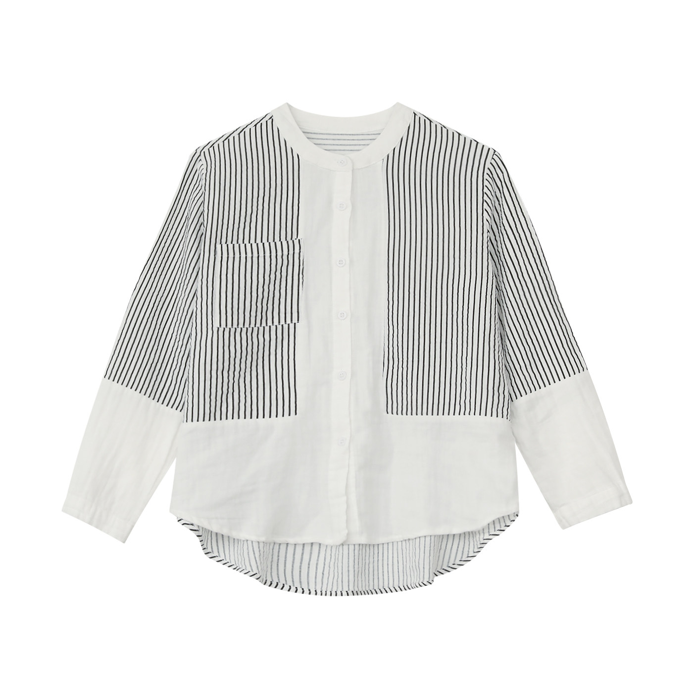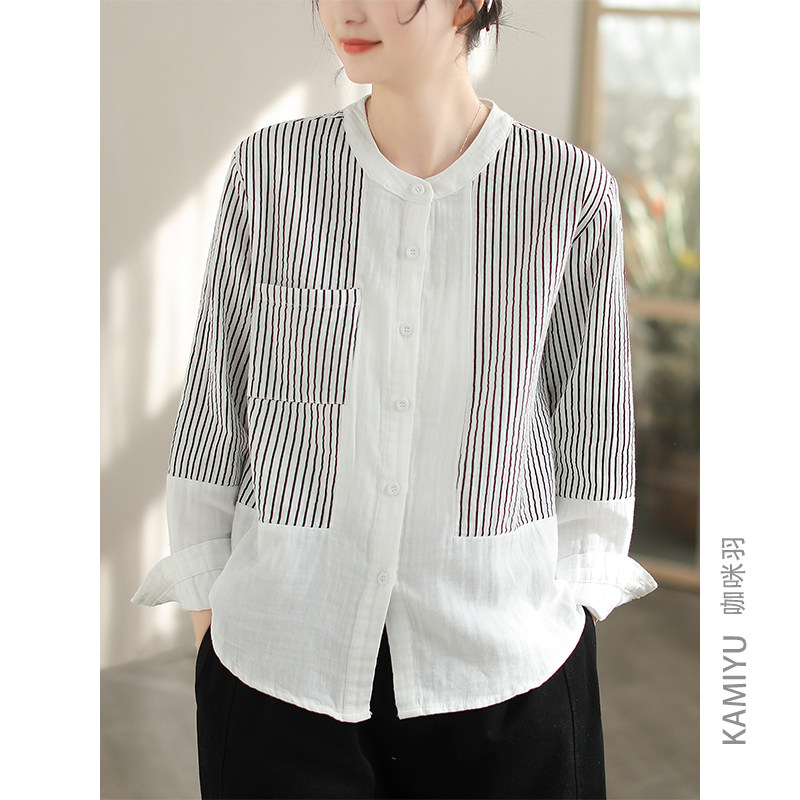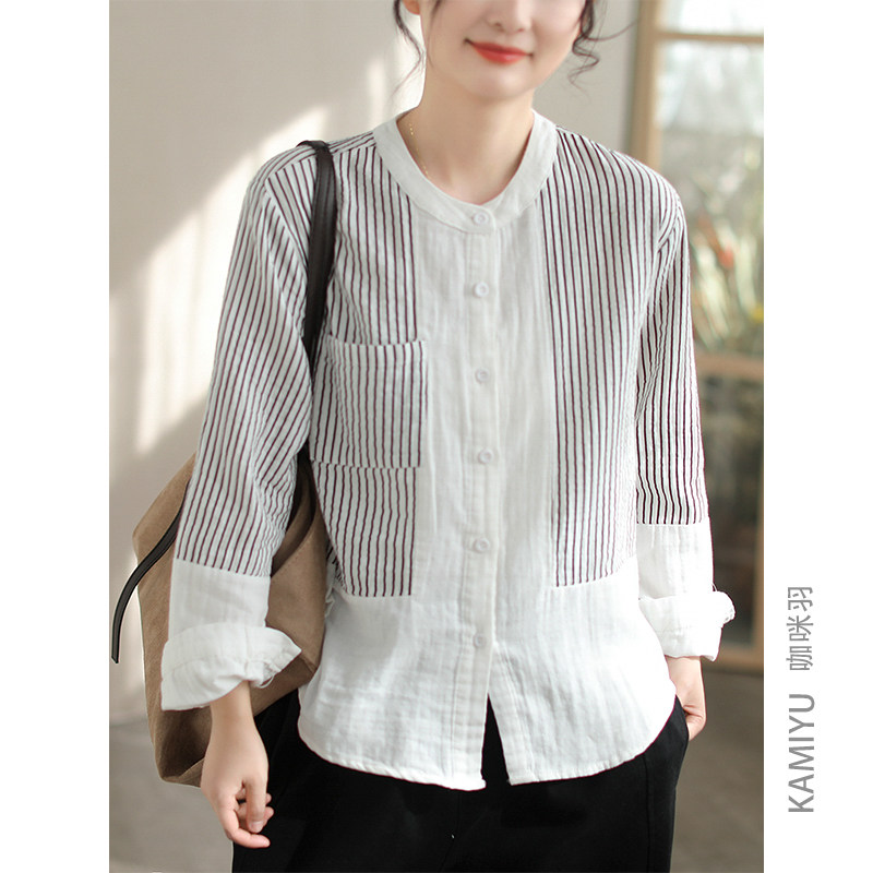 咖咪羽衬衫女春装新款双层棉纱撞色拼接休闲条纹设计款女装开衫女