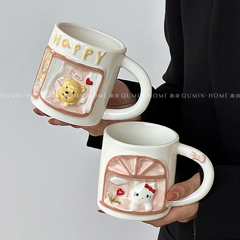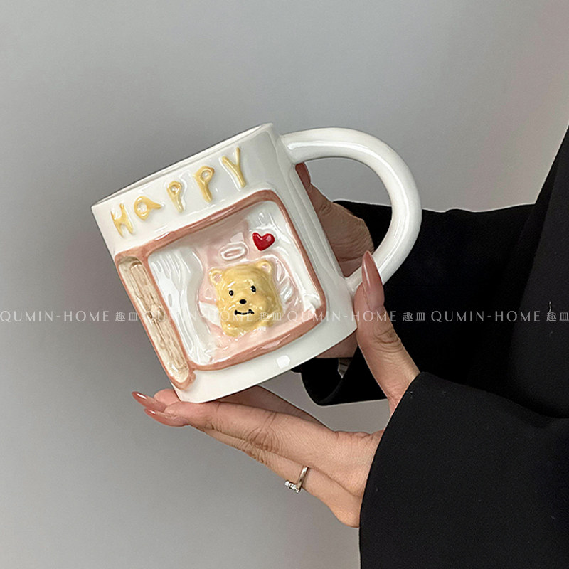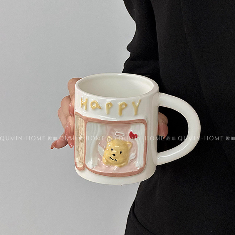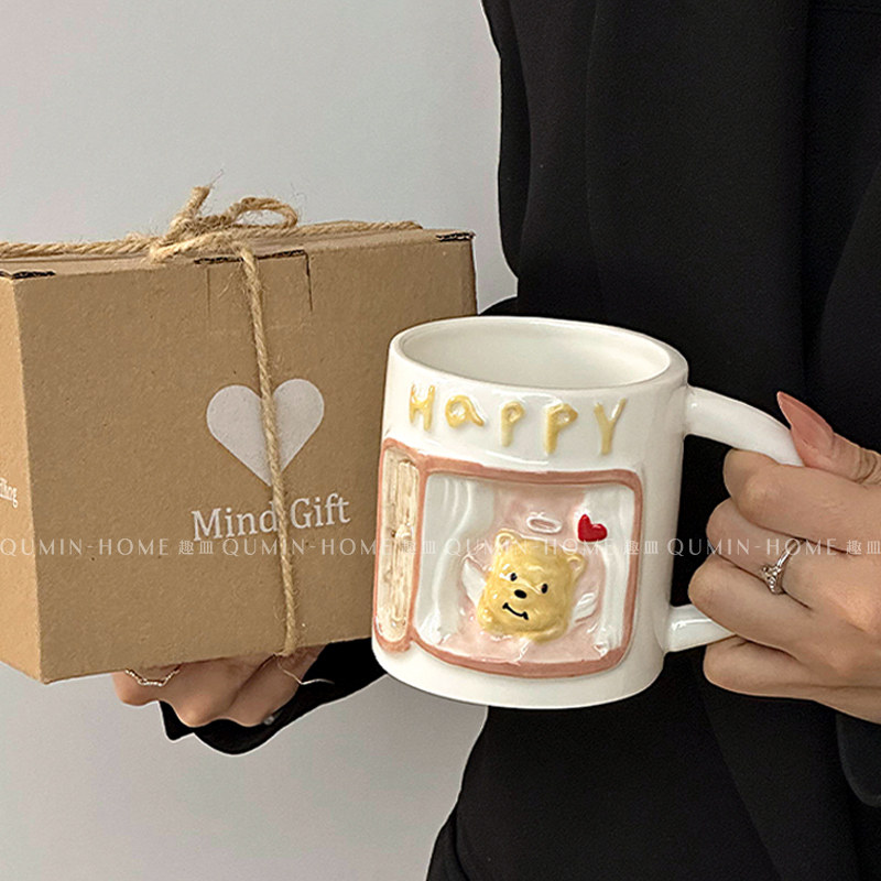 可爱珠光浮雕小熊马克杯高颜值陶瓷杯情侣咖啡杯耐热水杯子带礼盒