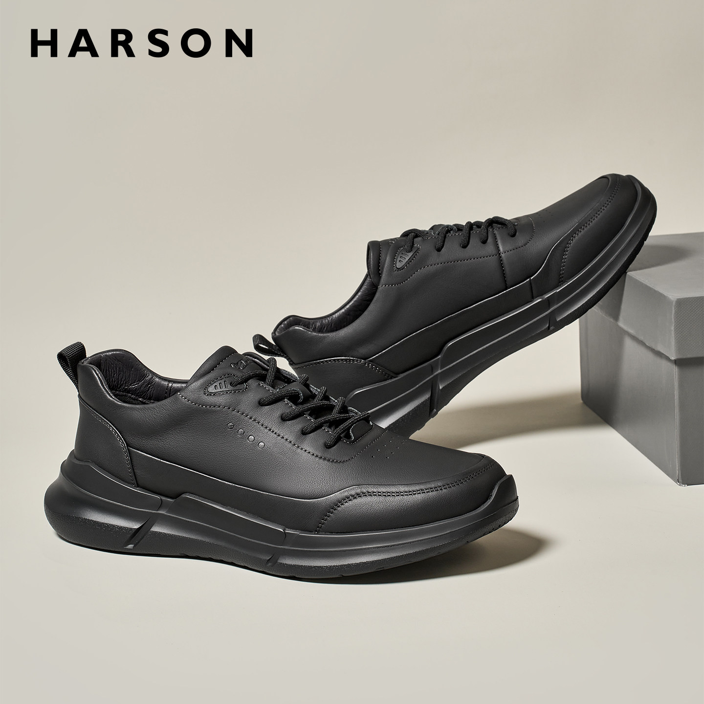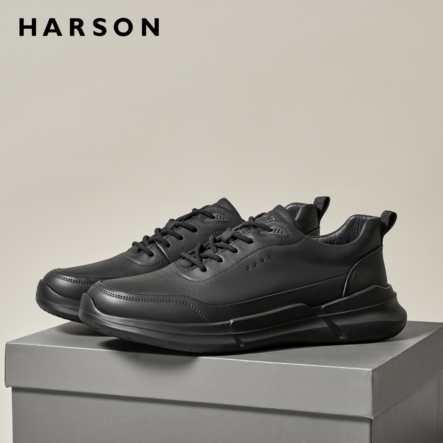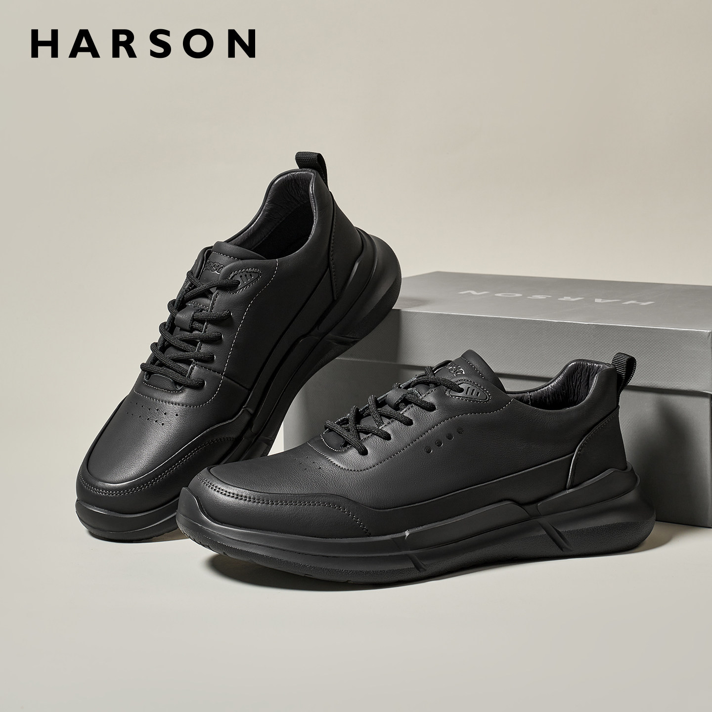 哈森冬季男鞋新款男士运动皮鞋全黑软底商务休闲鞋真皮公务通勤鞋