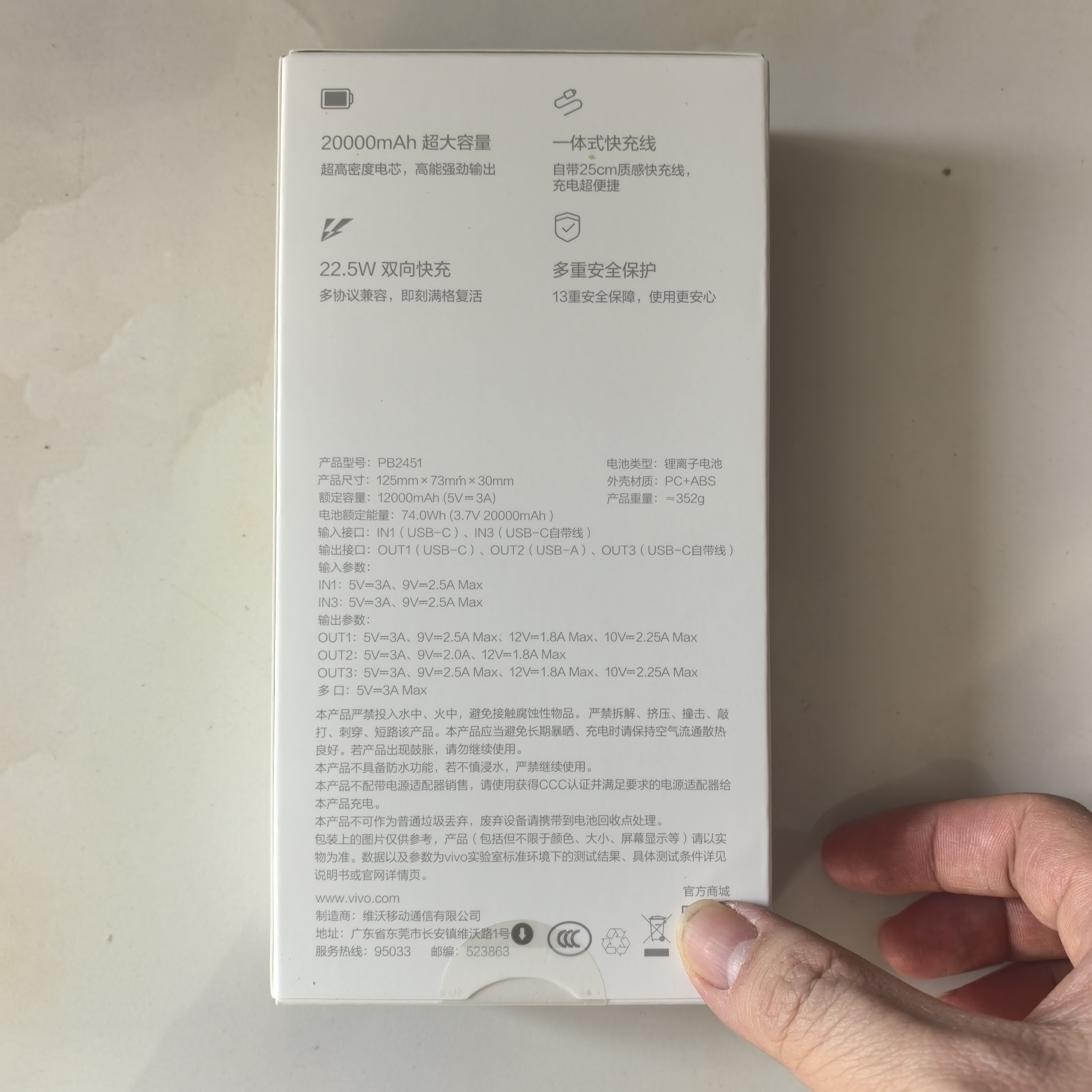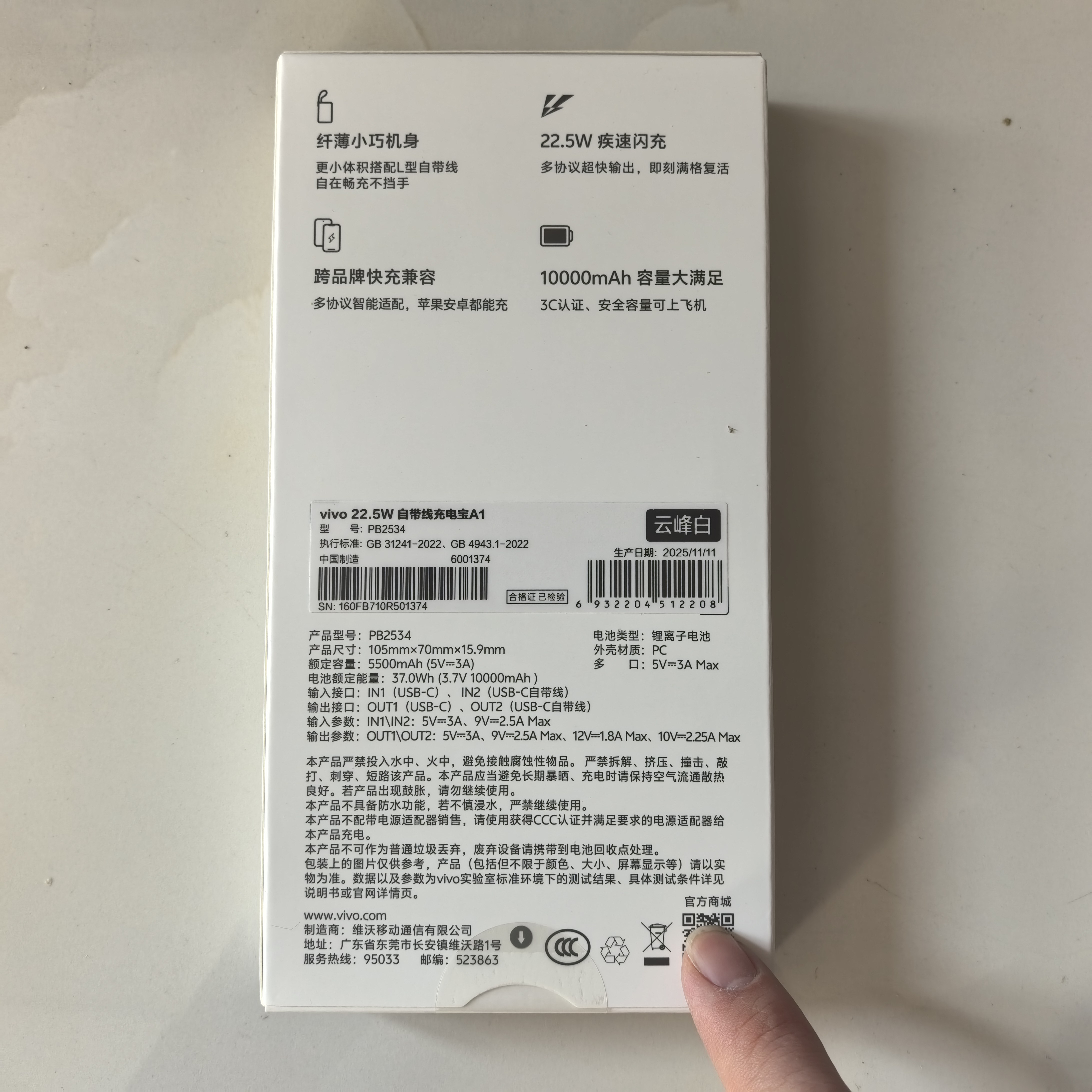 vivo22.5W移动电源10000毫安大容量充电宝自带线便携双向快充通用