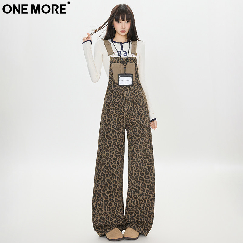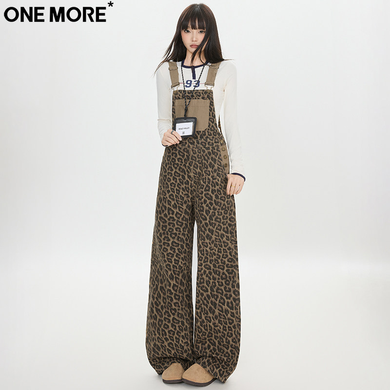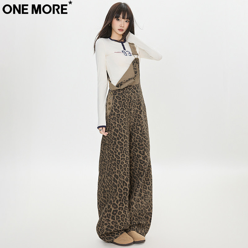 One More休闲潮流豹纹背带牛仔裤女秋季新款直筒宽松阔腿背带裤女