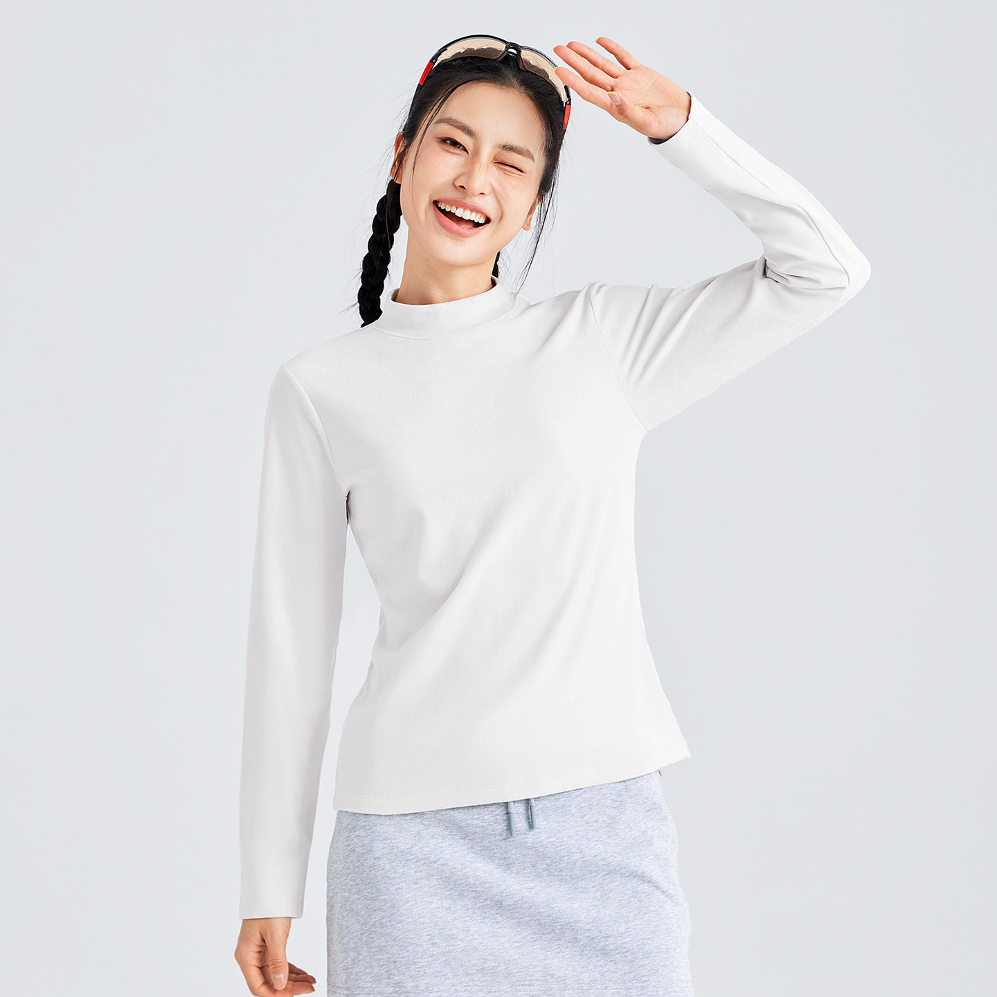 蕉下亨利衫女长袖T恤v领秋冬修身保暖低领打底衫半开领白色上衣