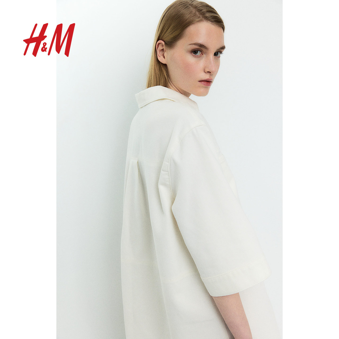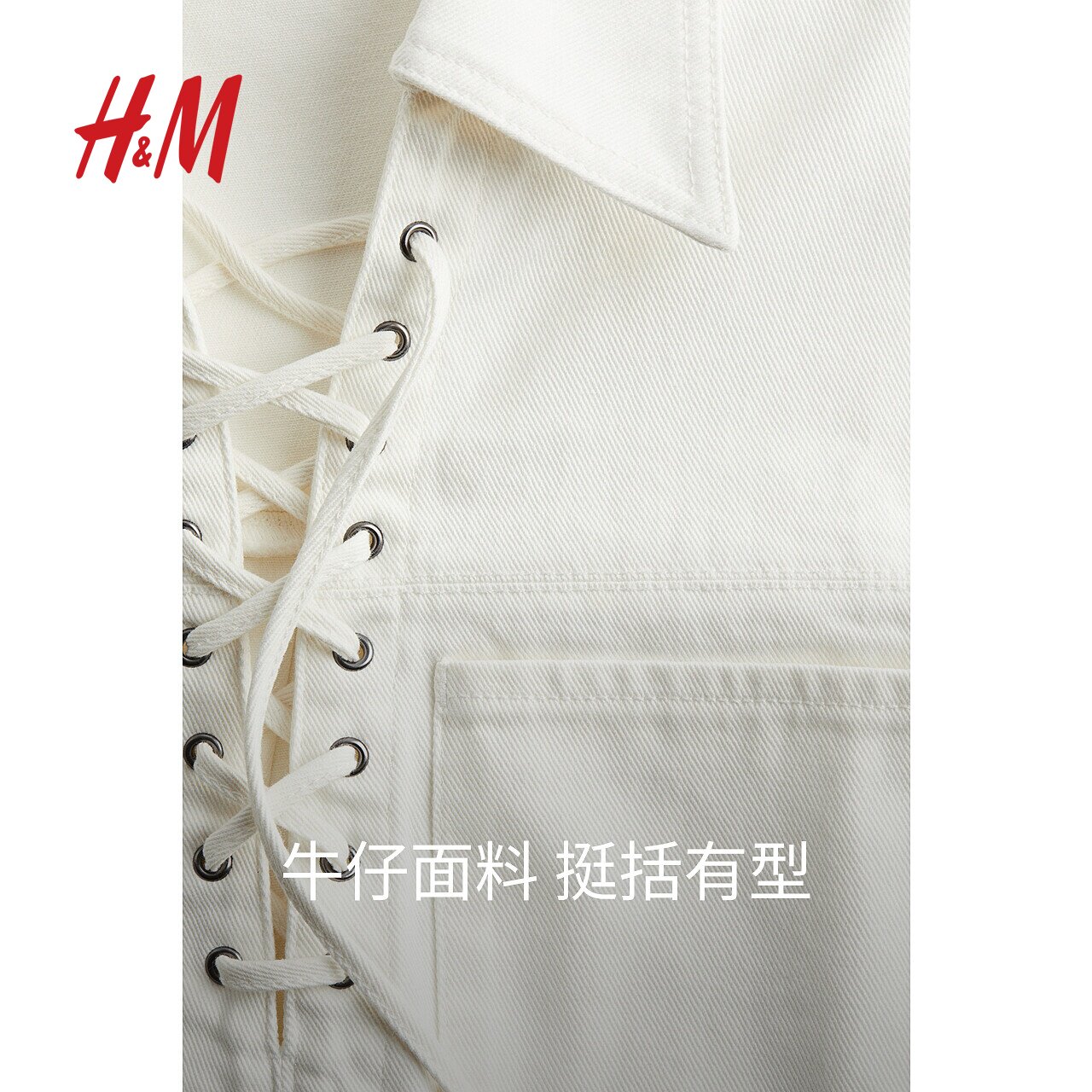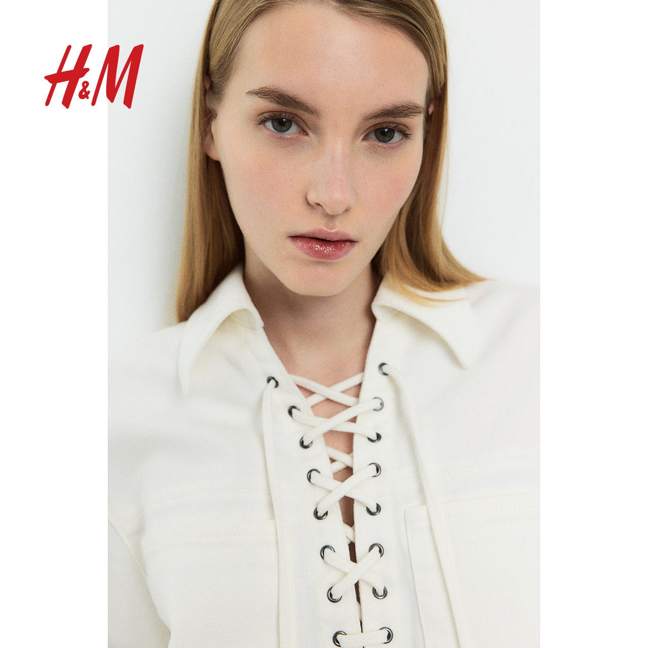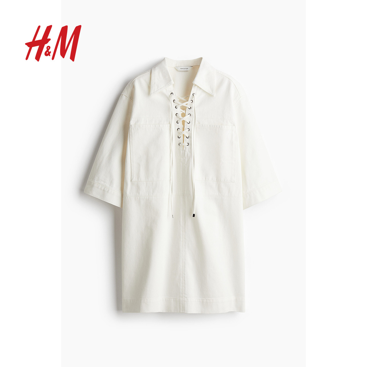 HM女装连衣裙2025冬季新款翻领宽松微落肩系带牛仔短裙1277303