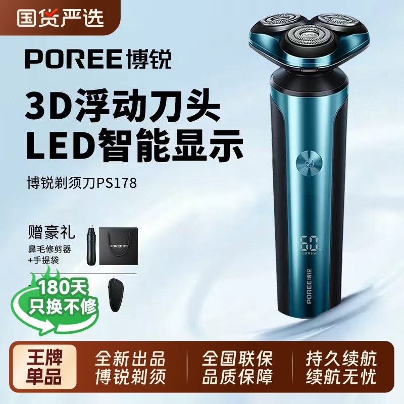 博锐剃须刀电动男士刮胡刀胡须刀刮胡子刀快充便携水洗礼物正品