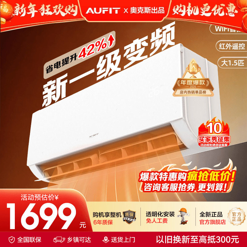 AUFIT空调奥克斯出品1.5匹1/2匹挂机3匹立式柜机一级能效冷暖变频