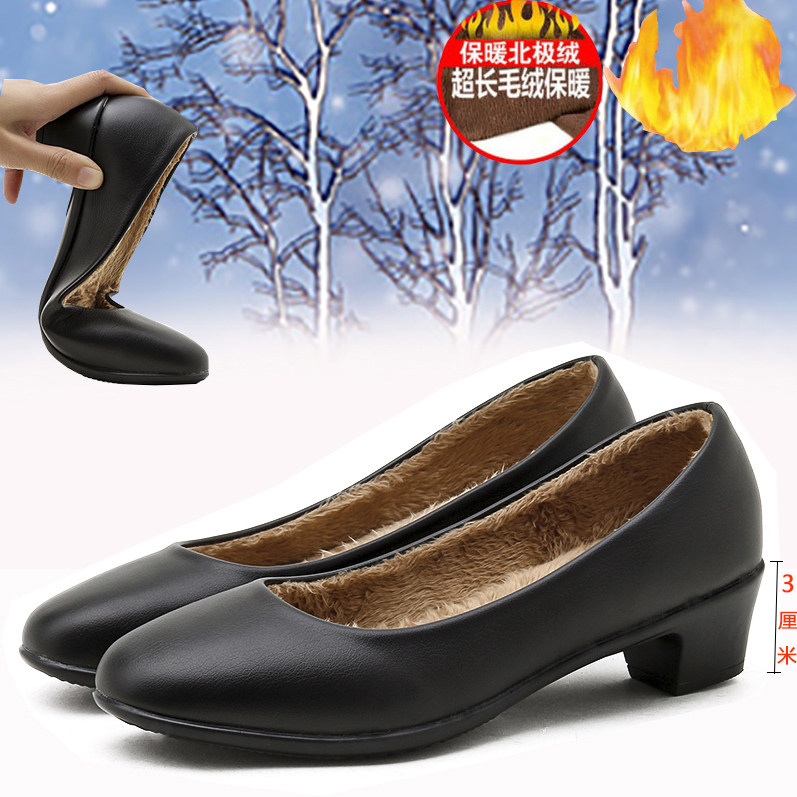 冬季保暖女鞋冬加绒毛毛鞋女式皮单鞋上班工作平底跟妈妈女鞋圆头