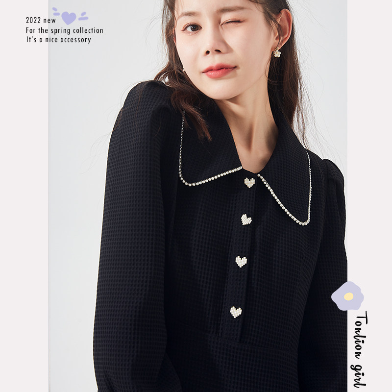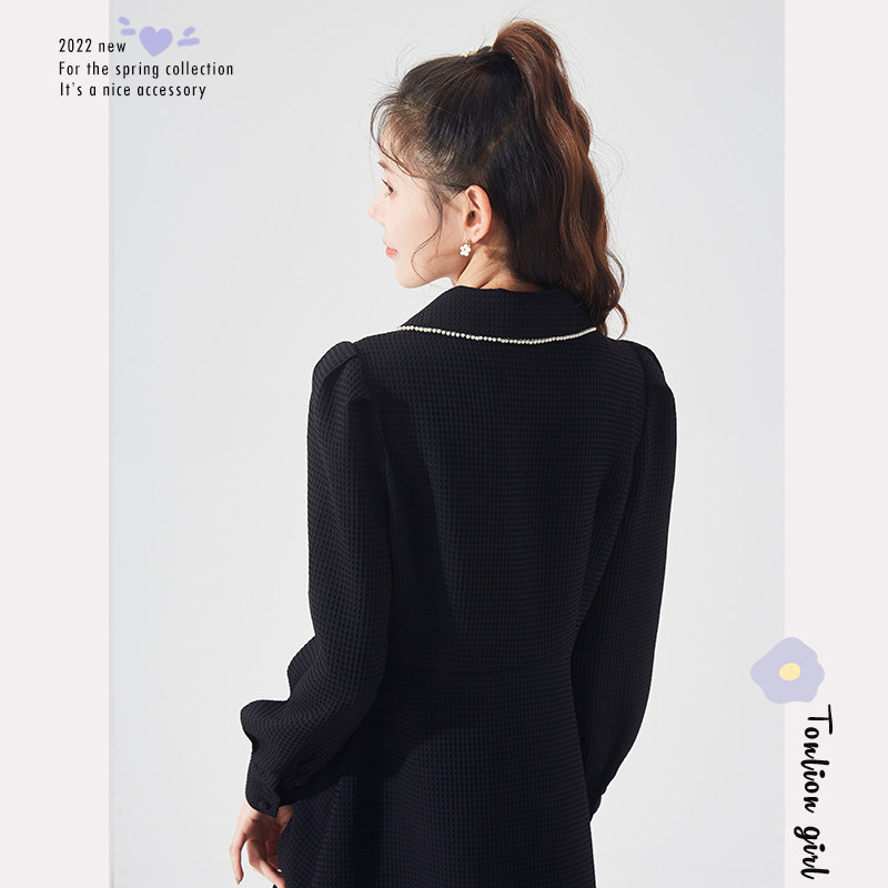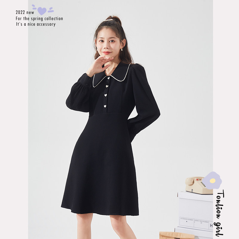 唐狮肌理面料小黑裙春秋季新款女装黑色连衣裙长袖收腰显瘦裙子