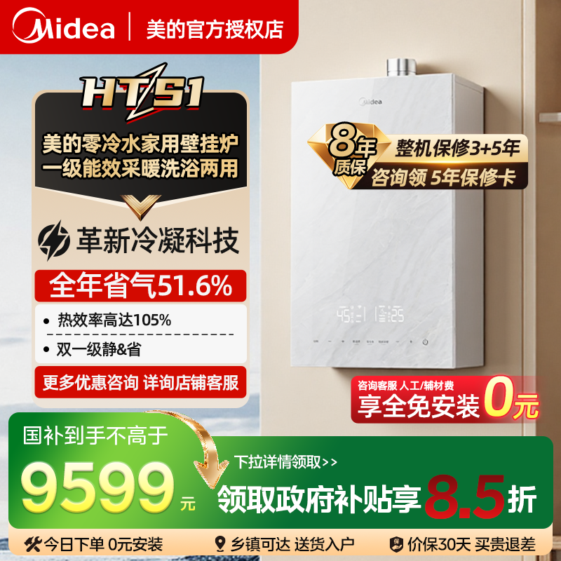 美的壁挂炉HTS1家用一级能效零冷水天然气采暖炉地暖锅炉热水器