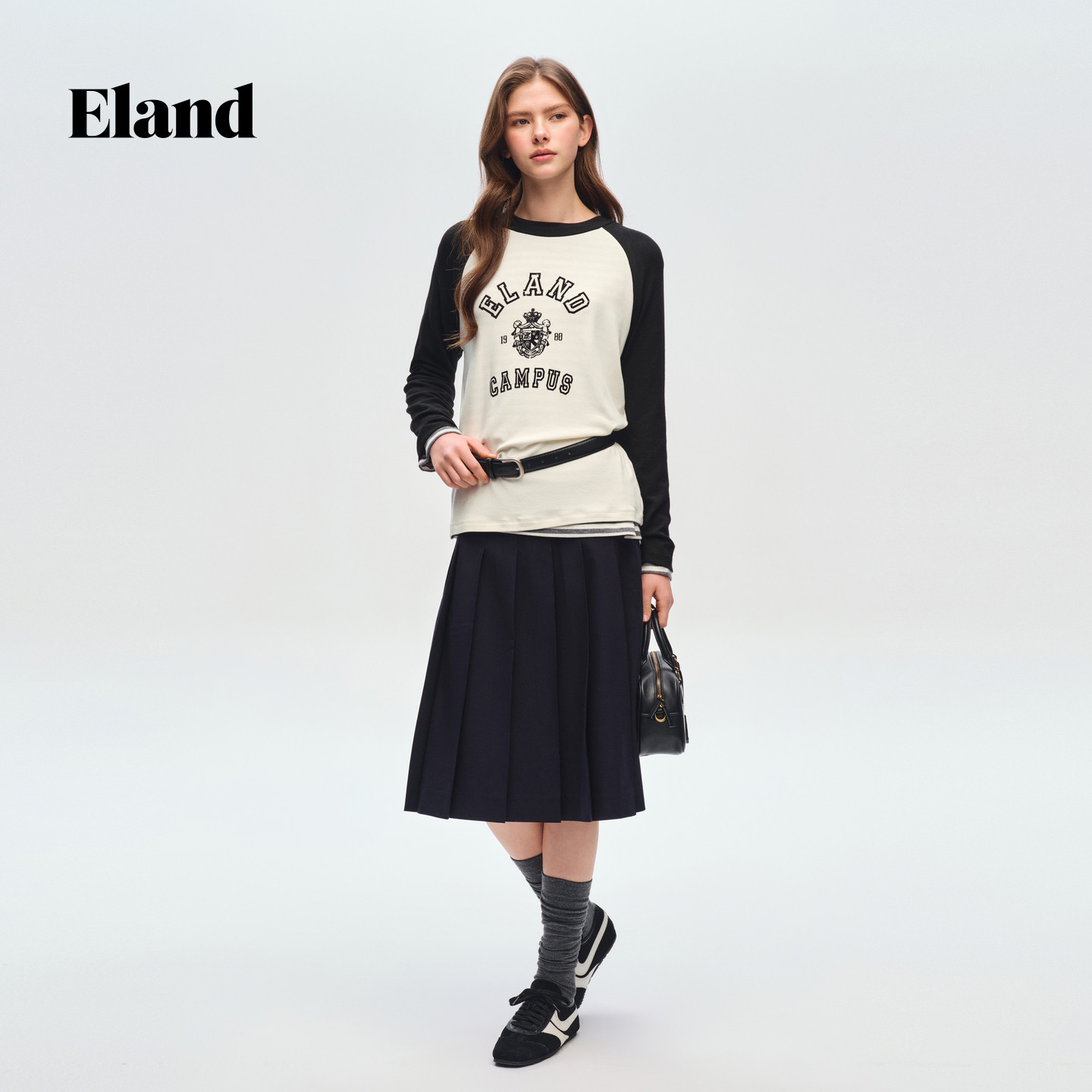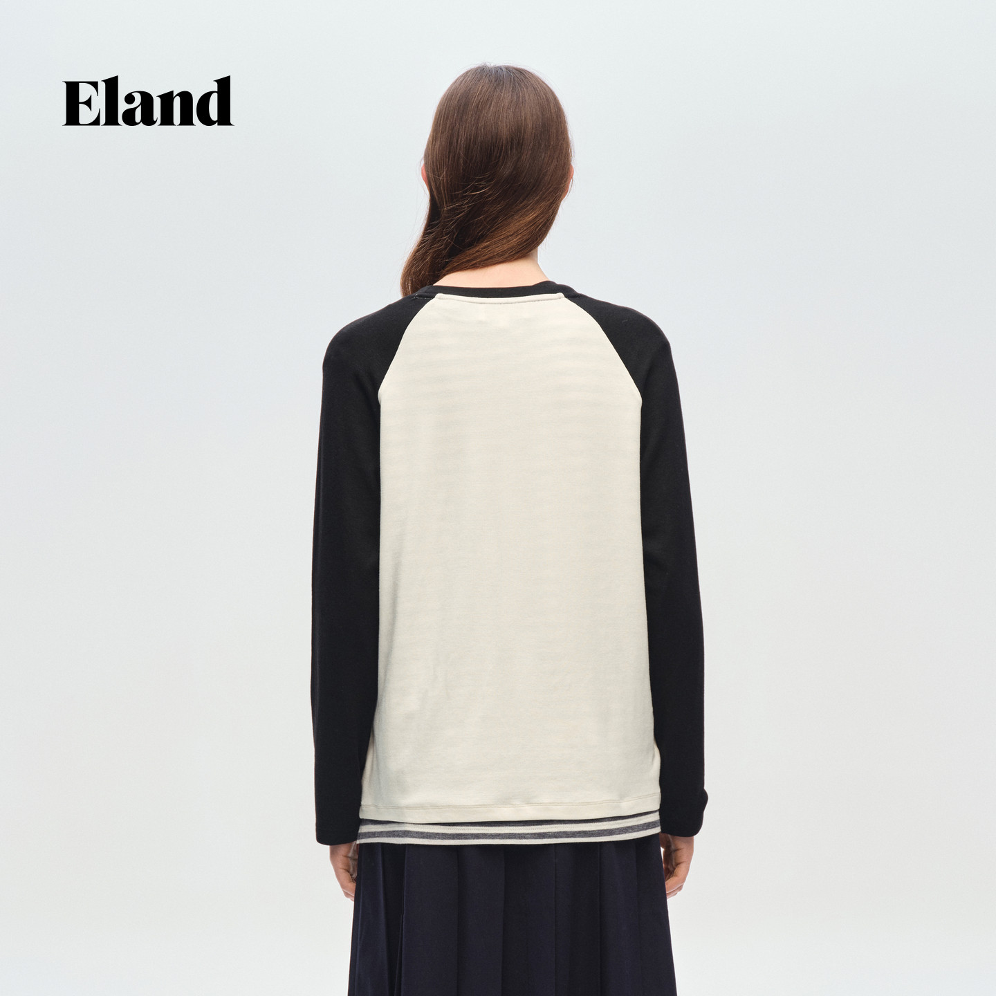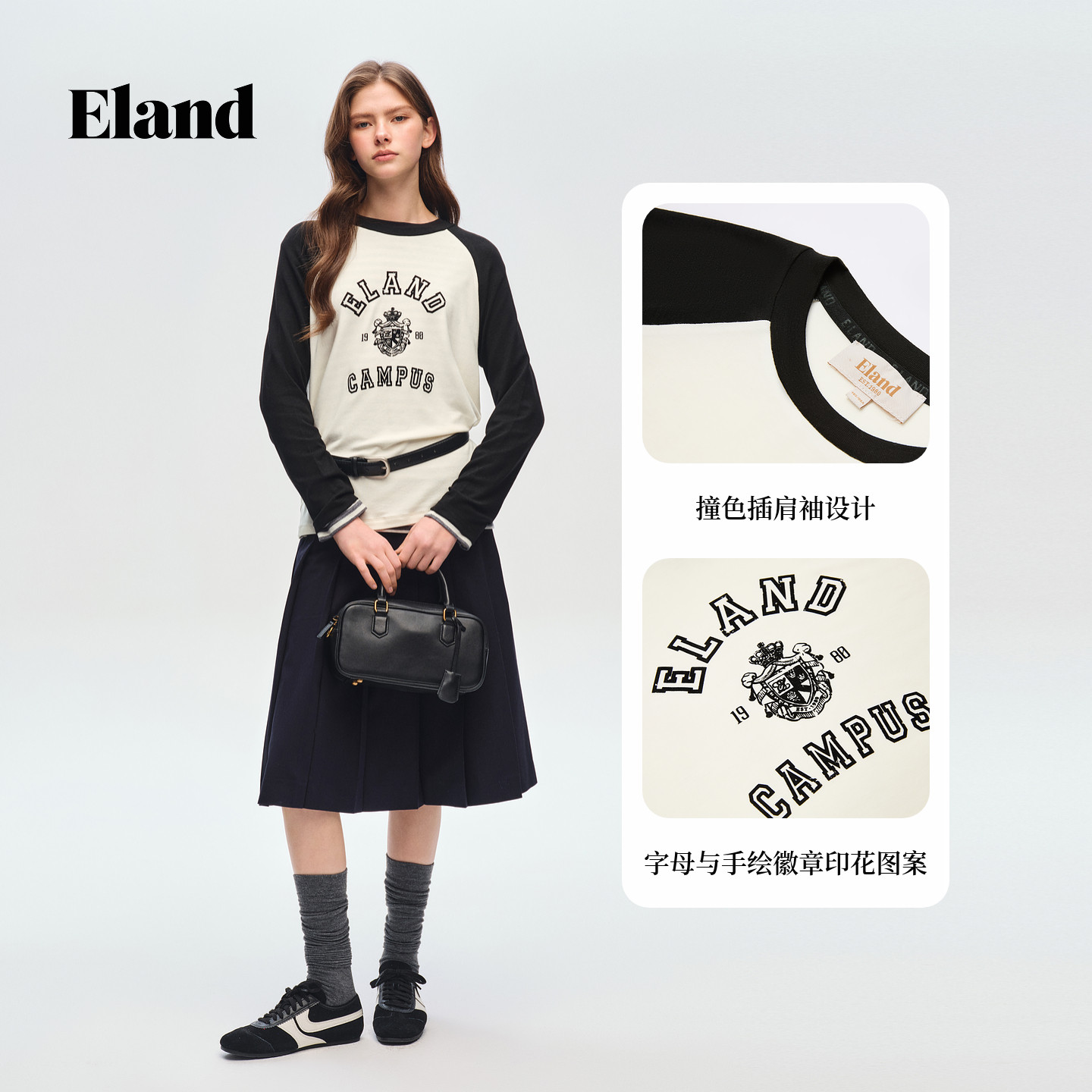 【绵羊毛】Eland衣恋T恤女时尚黑白撞色长袖印花上衣2026春季新款