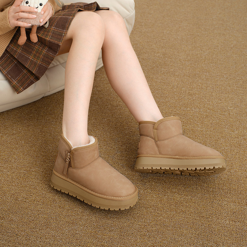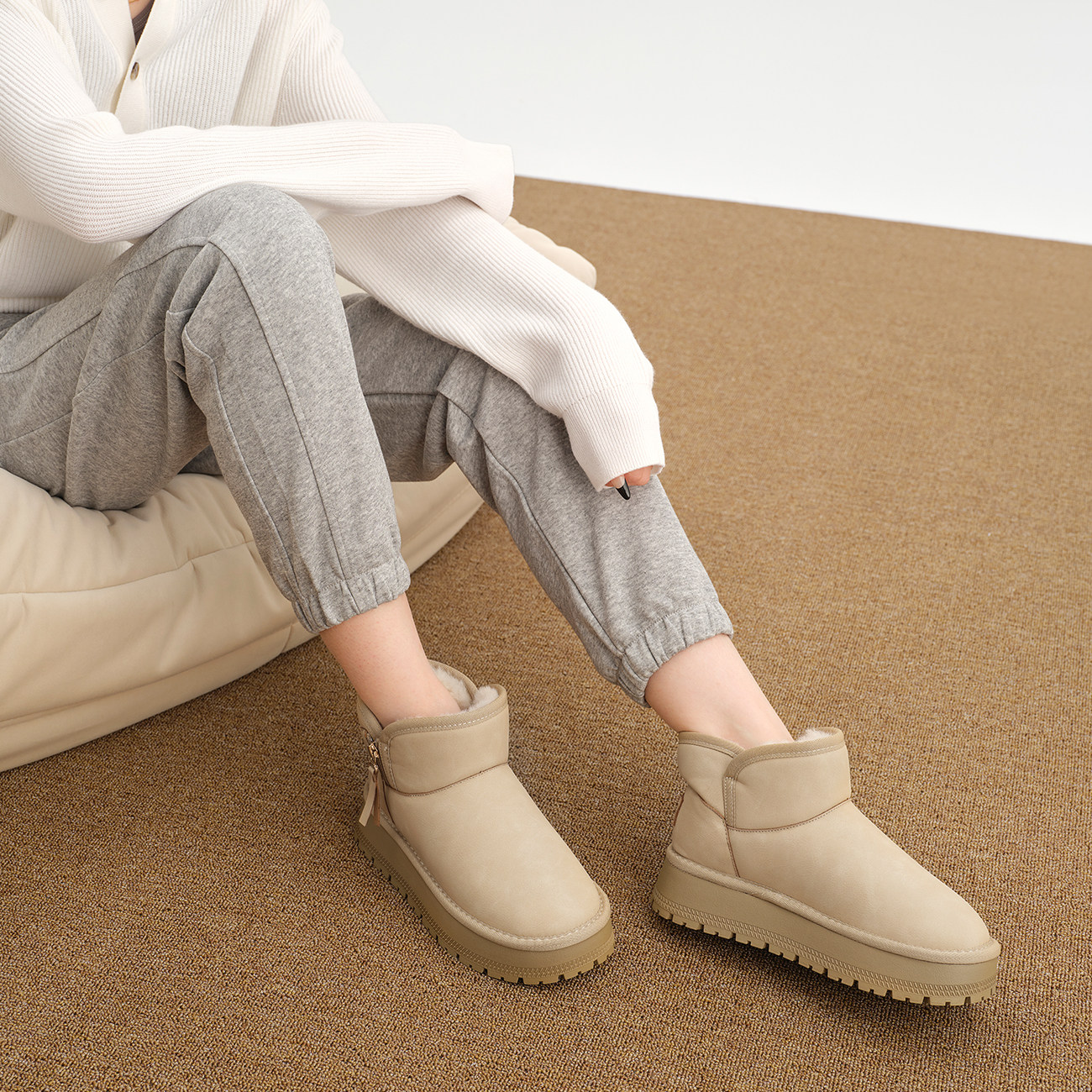 miu家厚底雪地靴女冬季真皮短靴羊毛侧拉链增高厚底加绒毛毛棉鞋