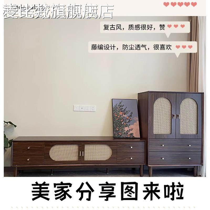 麦比梵实木中古风电视机柜复古藤编茶几2025新款客厅家用法式落地储物柜床笠拉车