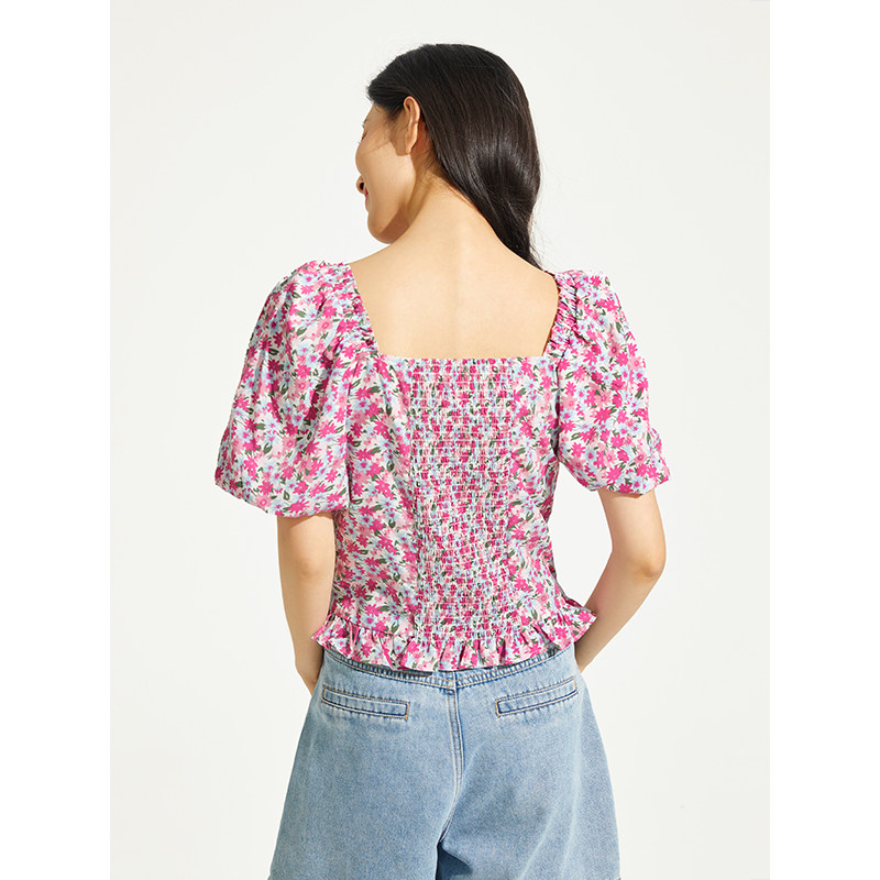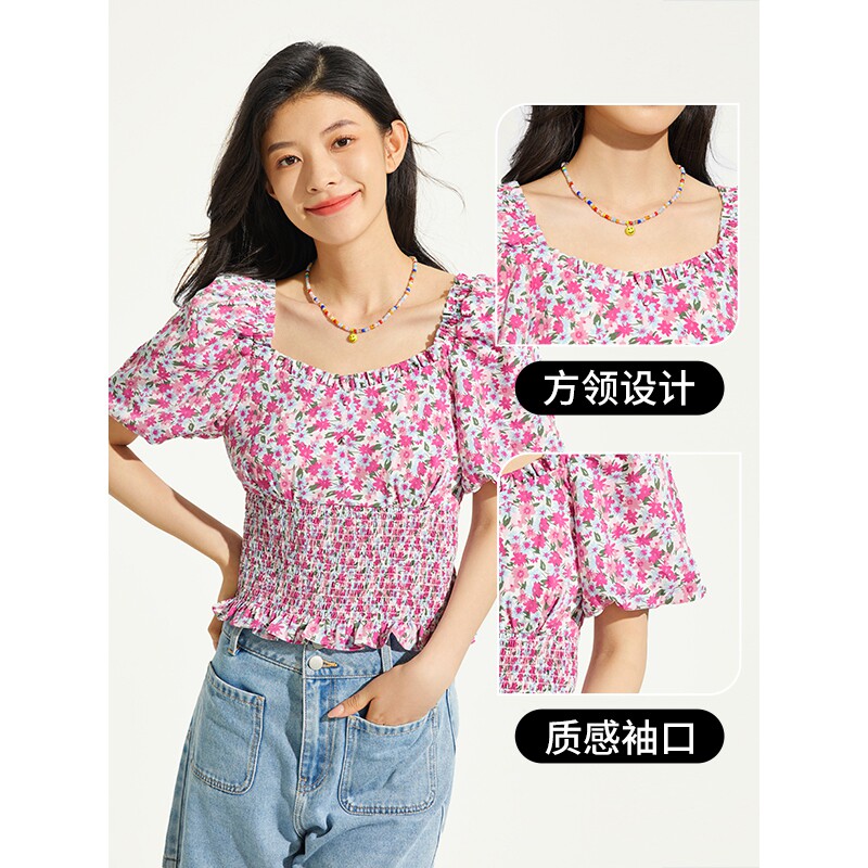热风2023年夏季新款女士法式优雅碎花上衣甜美百搭短款短袖上衣女