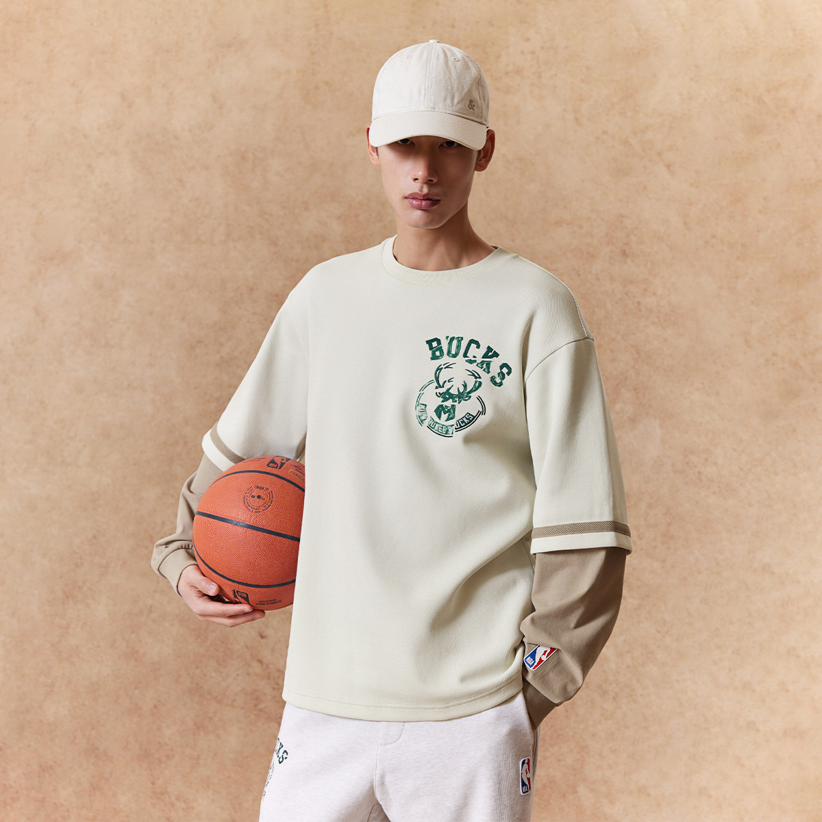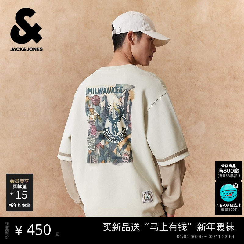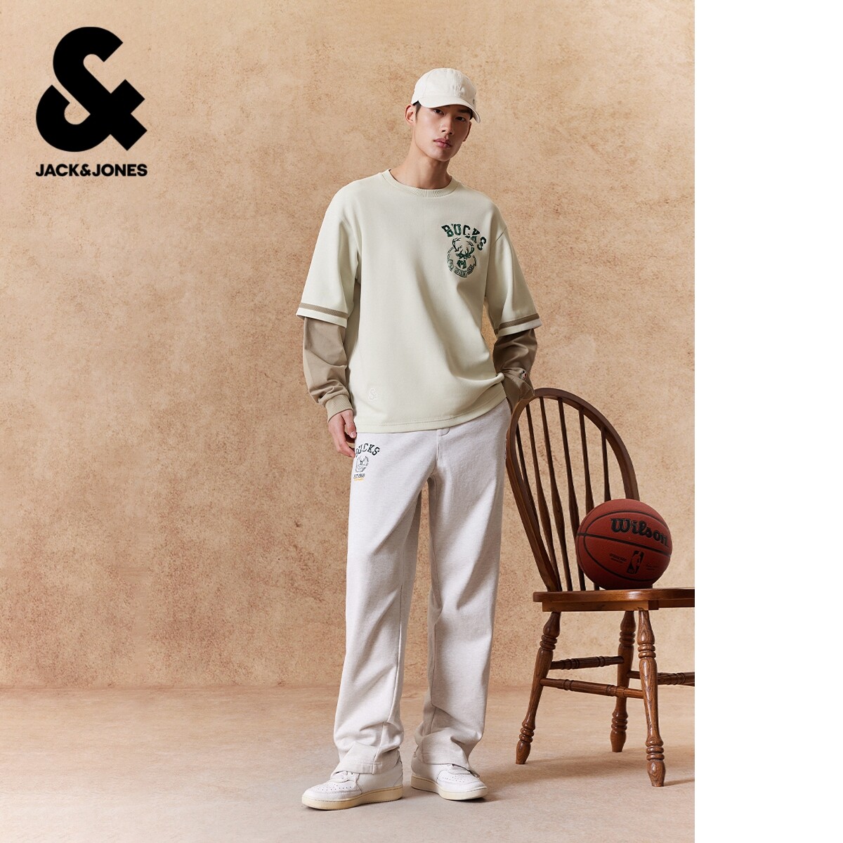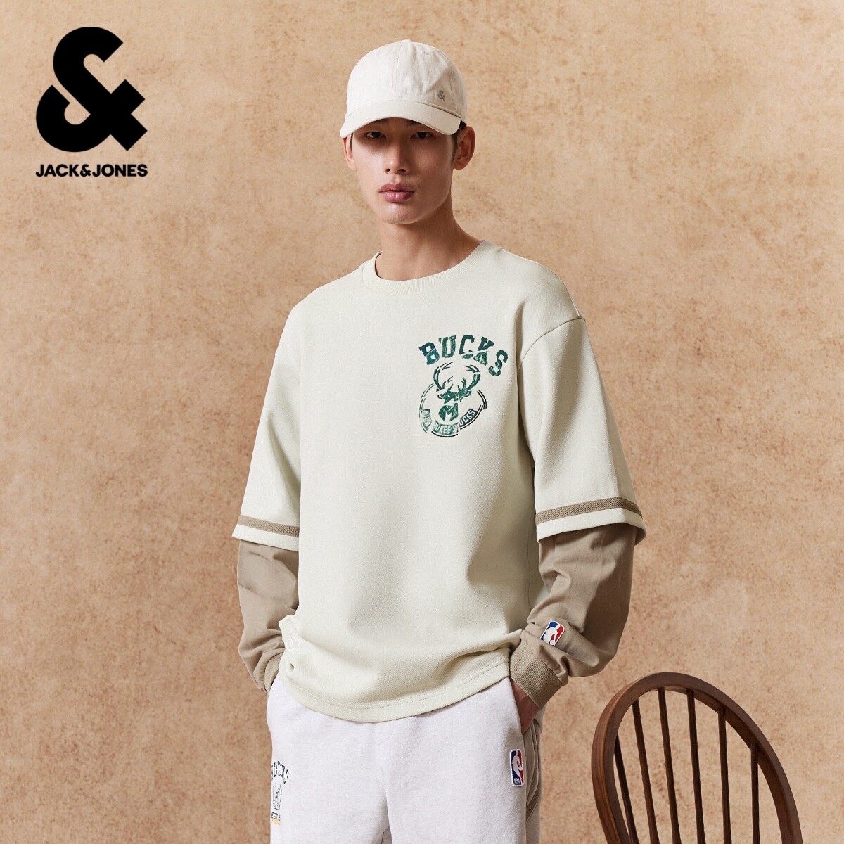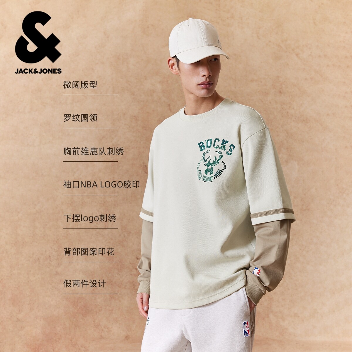 【NBA联名款雄鹿队】杰克琼斯男装春季T恤假两件刺绣圆领宽松