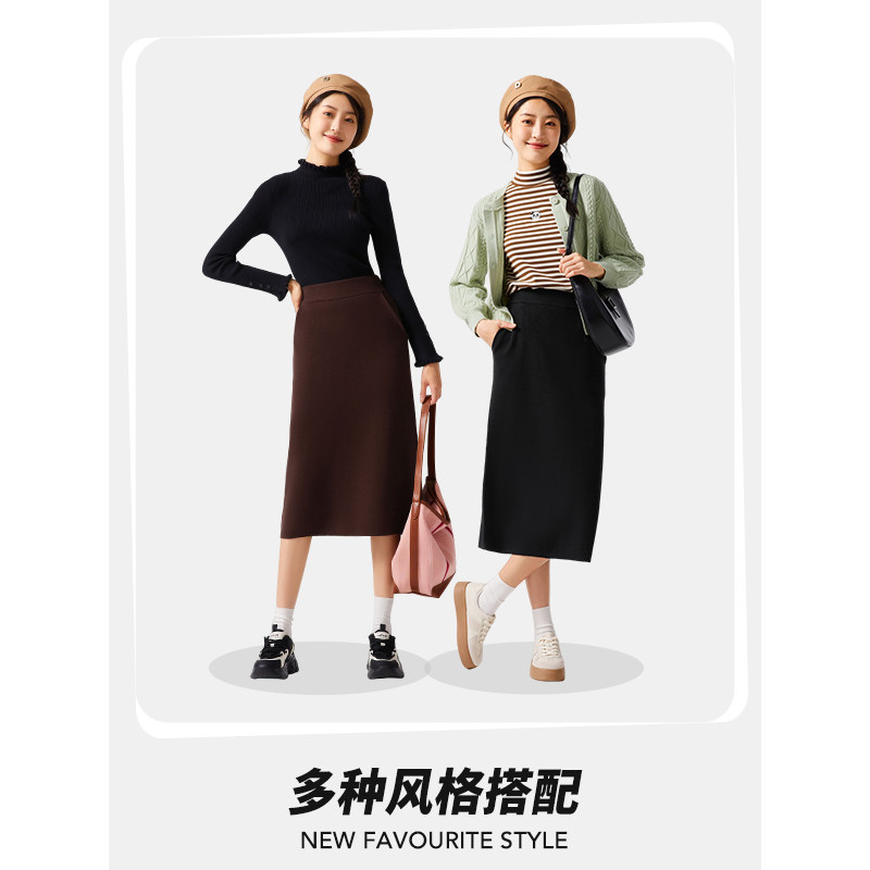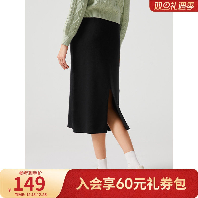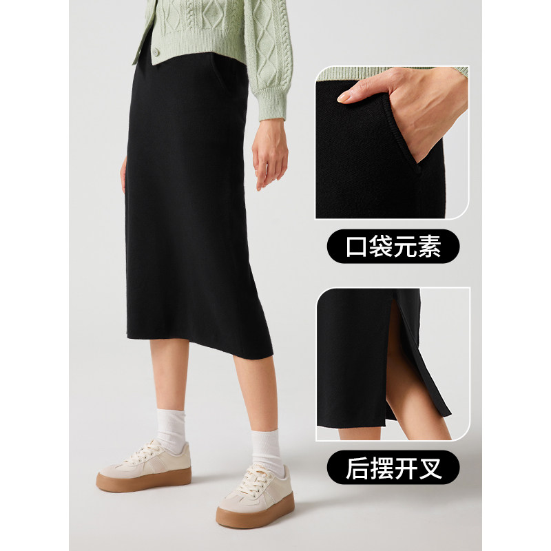 热风2023年冬季新款女士简约直筒针织半裙设计感后开叉显瘦中长裙