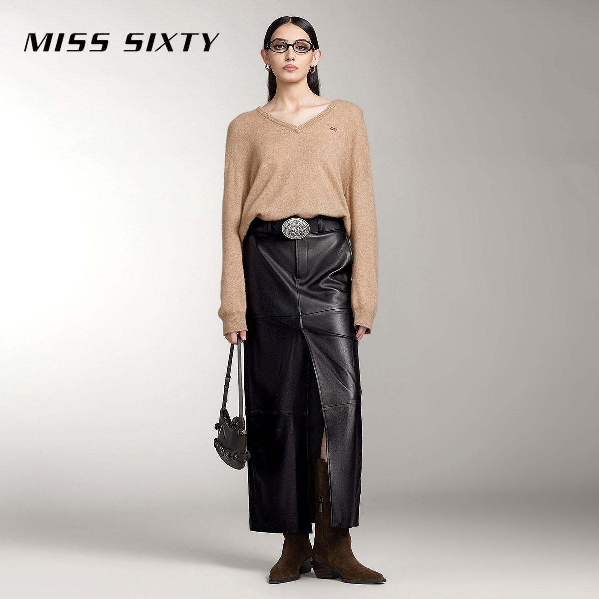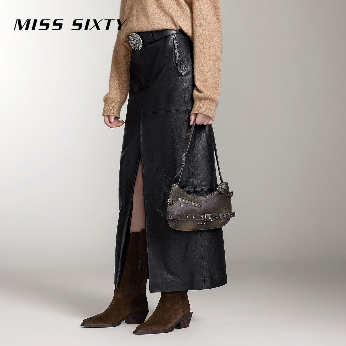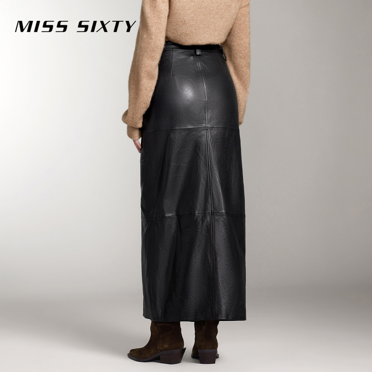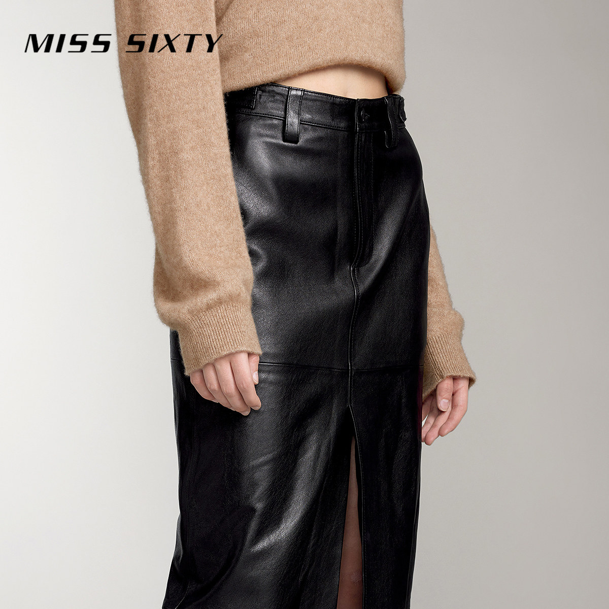 Miss Sixty真皮长裙女拼接设计性感开衩半身裙气质通勤风高级感