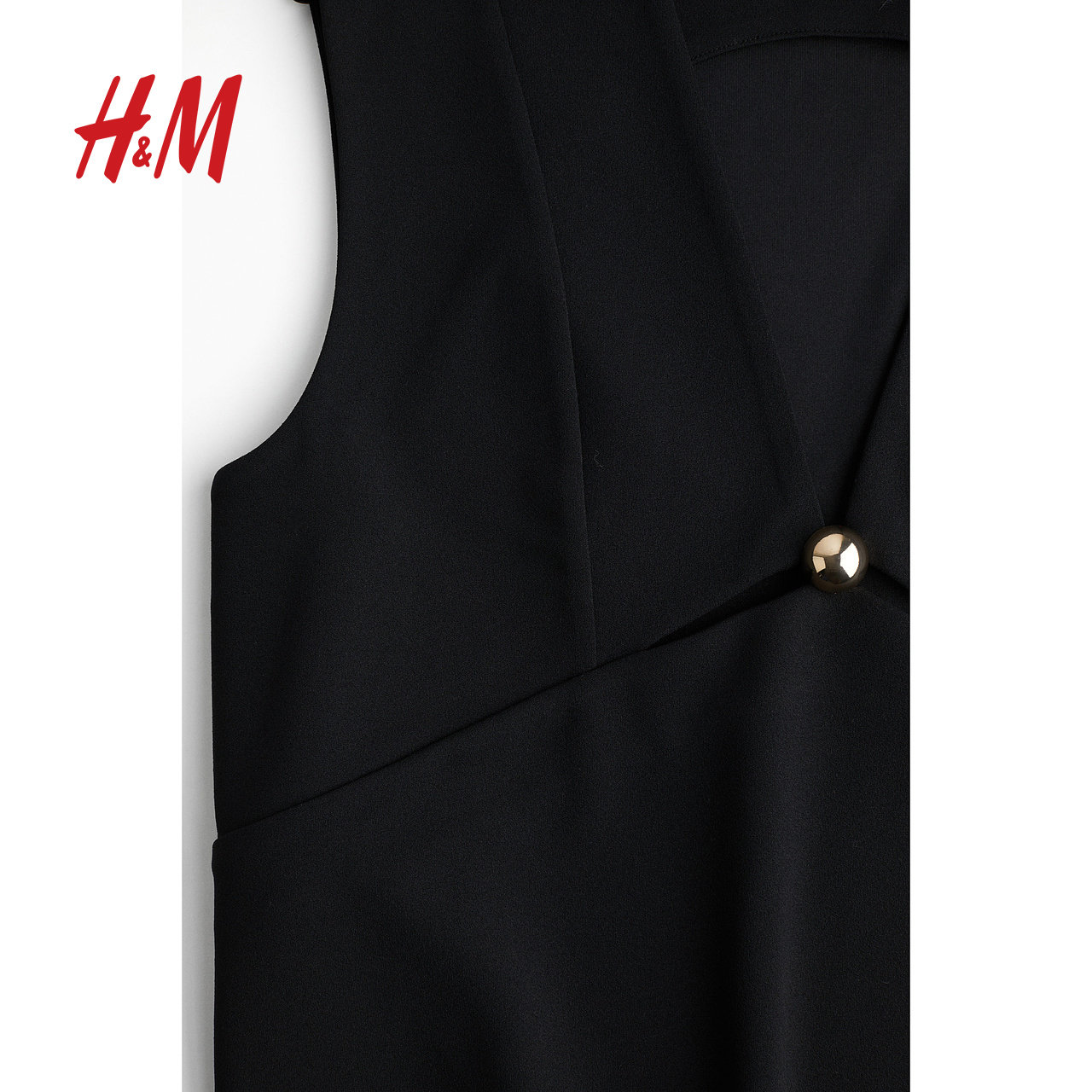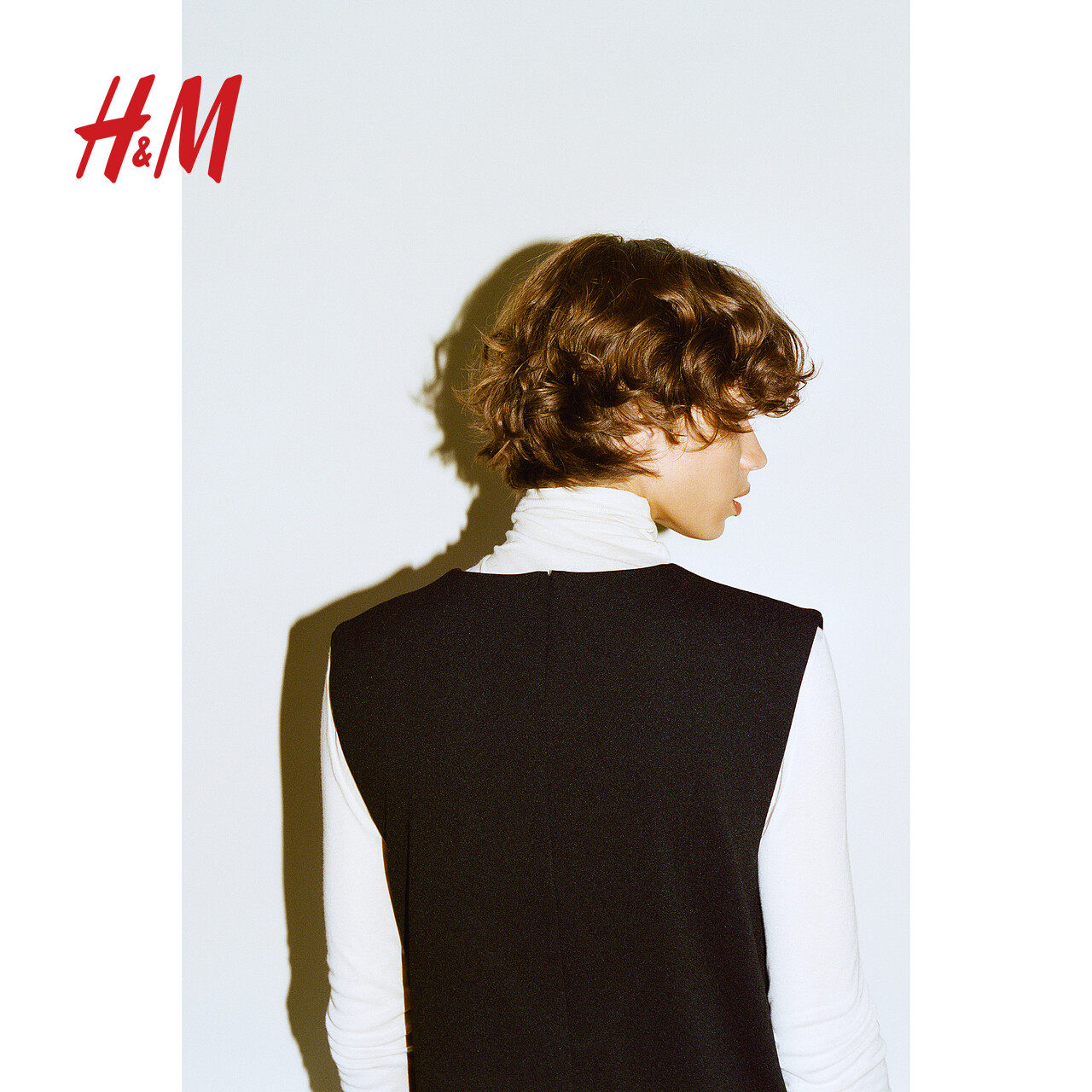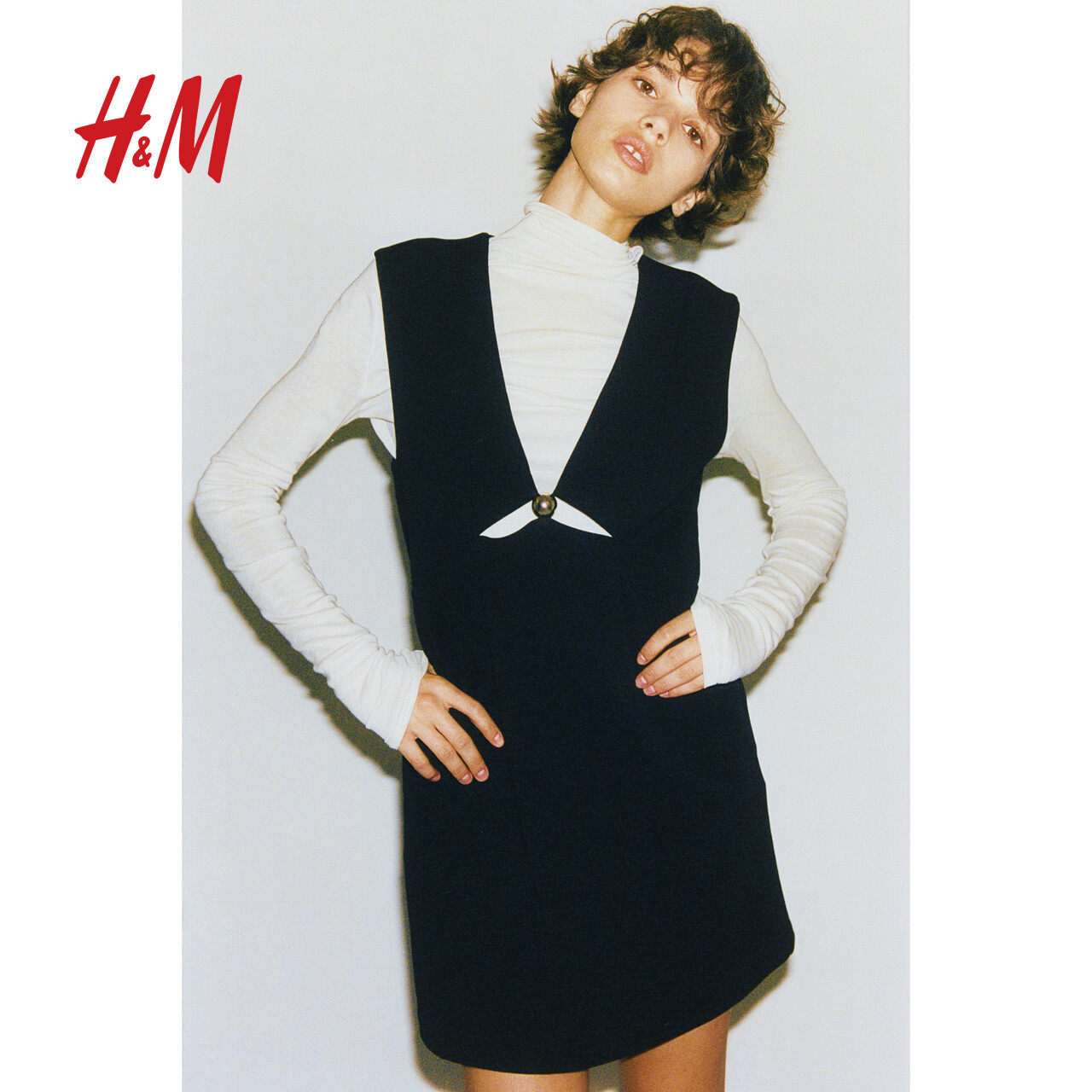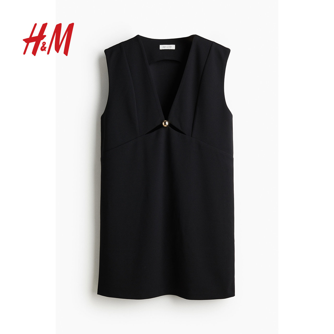 HM女装连衣裙冬季修身V领优雅无袖绉织舒适短裙1257272