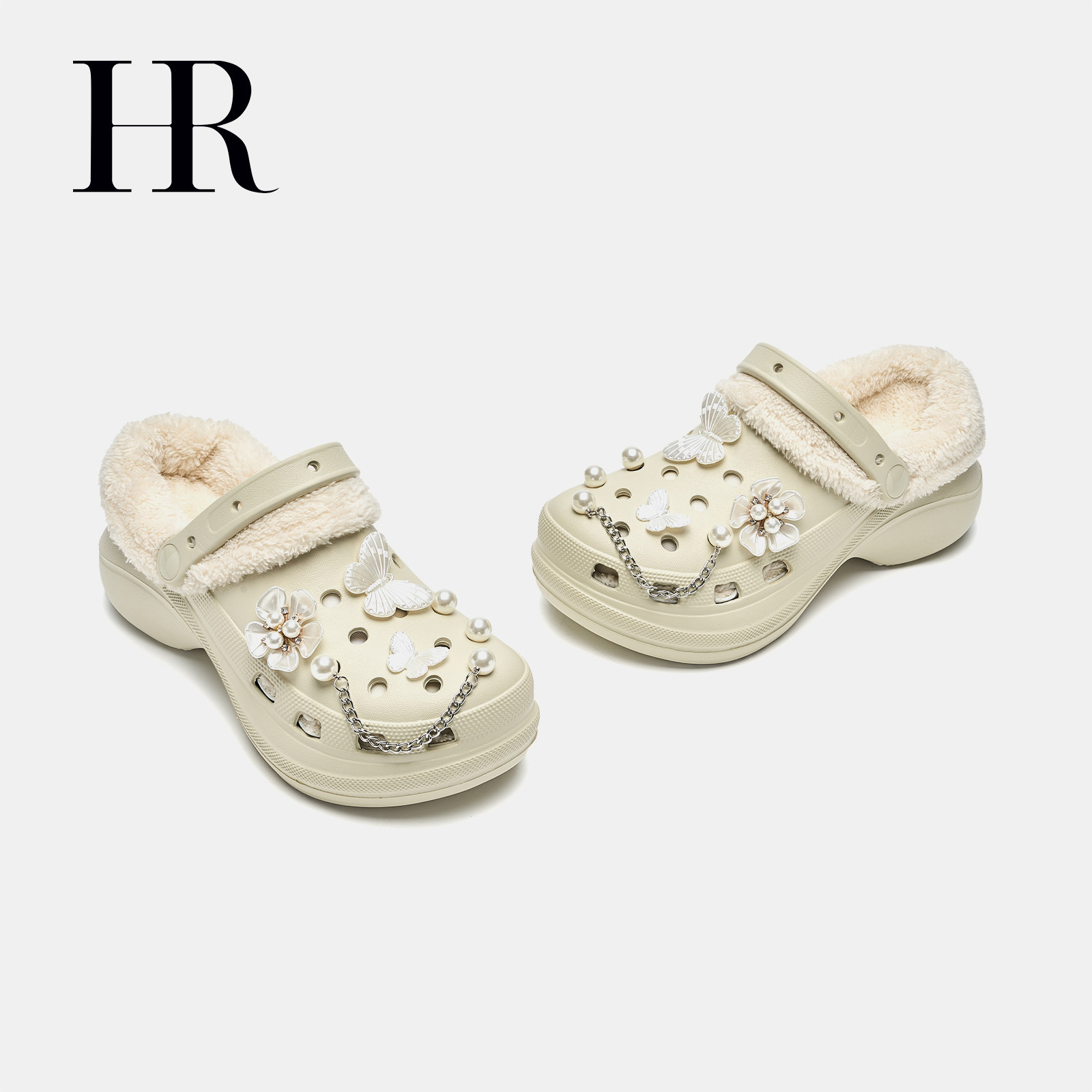 HR赫莲娜女鞋子2026冬季新款洞洞鞋厚底加绒保暖可拆卸懒人包头拖