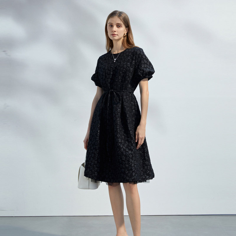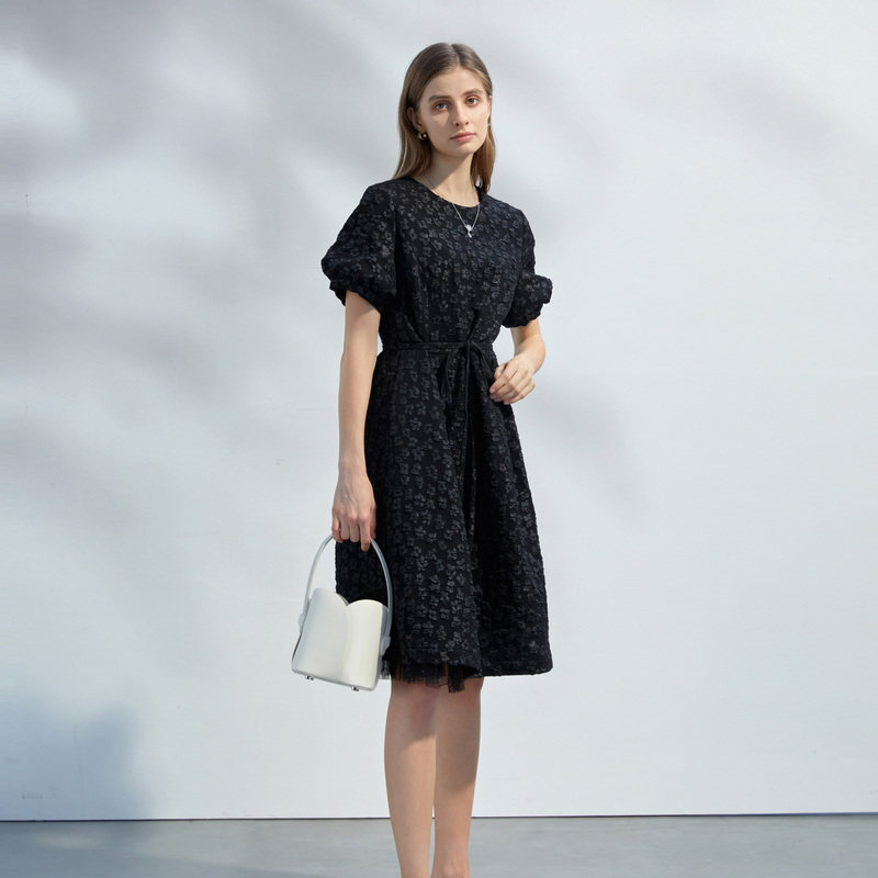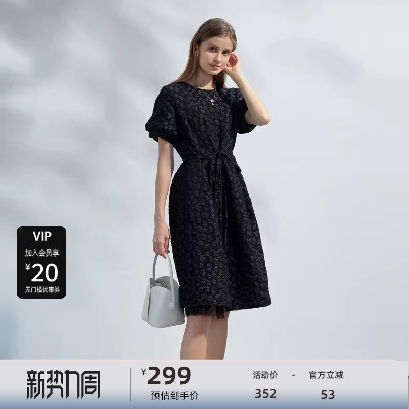 【热销补货】欧时力 褶皱短袖连衣裙女2026春新款收腰显瘦小黑裙