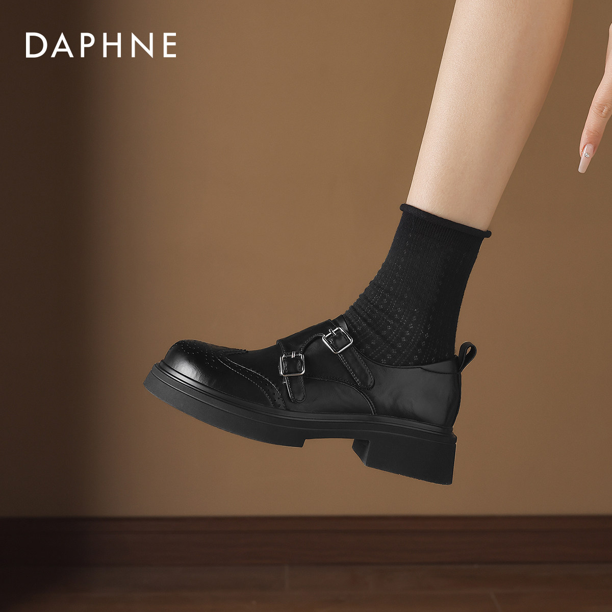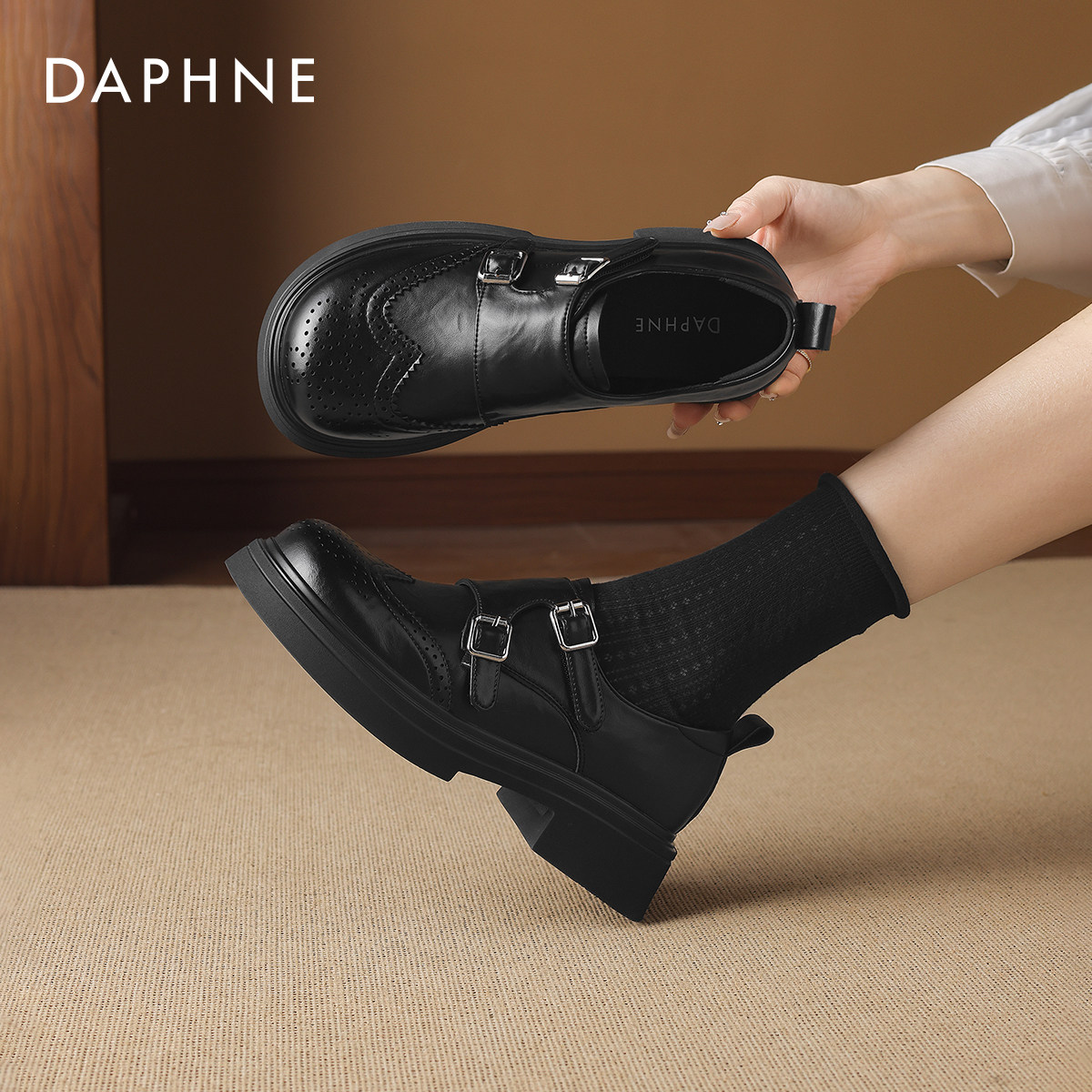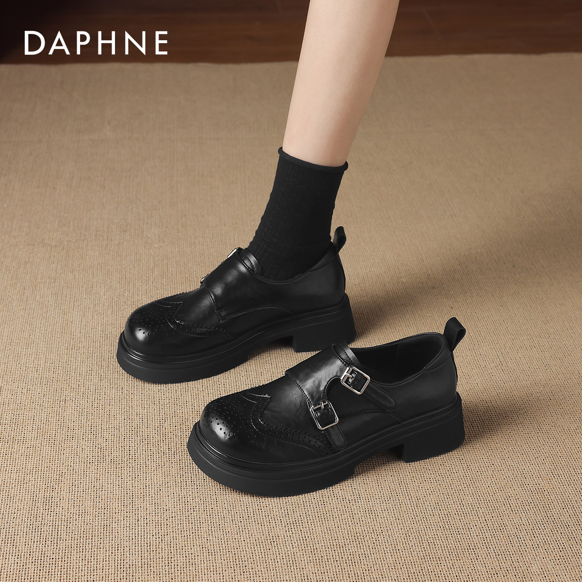 达芙妮黑色乐福鞋女款2026新款春季英伦厚底小皮鞋布洛克鞋豆豆鞋