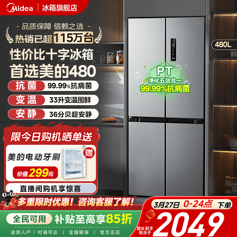 美的480L十字对开双开四门大容量家用一级冰箱风冷无霜超薄嵌入式