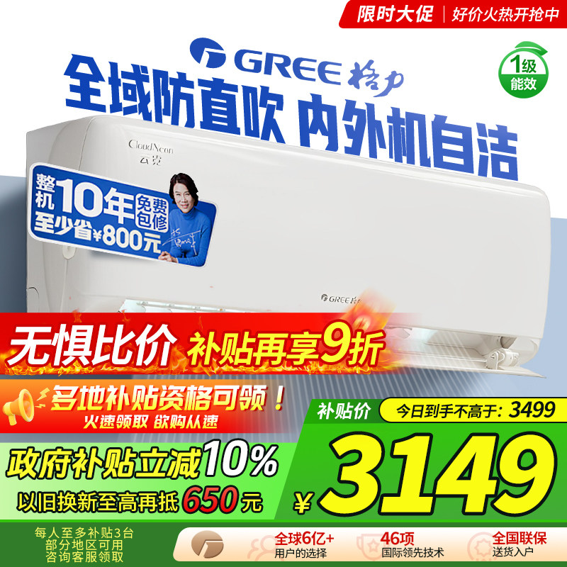 格力空调 大1匹新一级能效变频冷暖家用节能省电防直吹云霓挂机