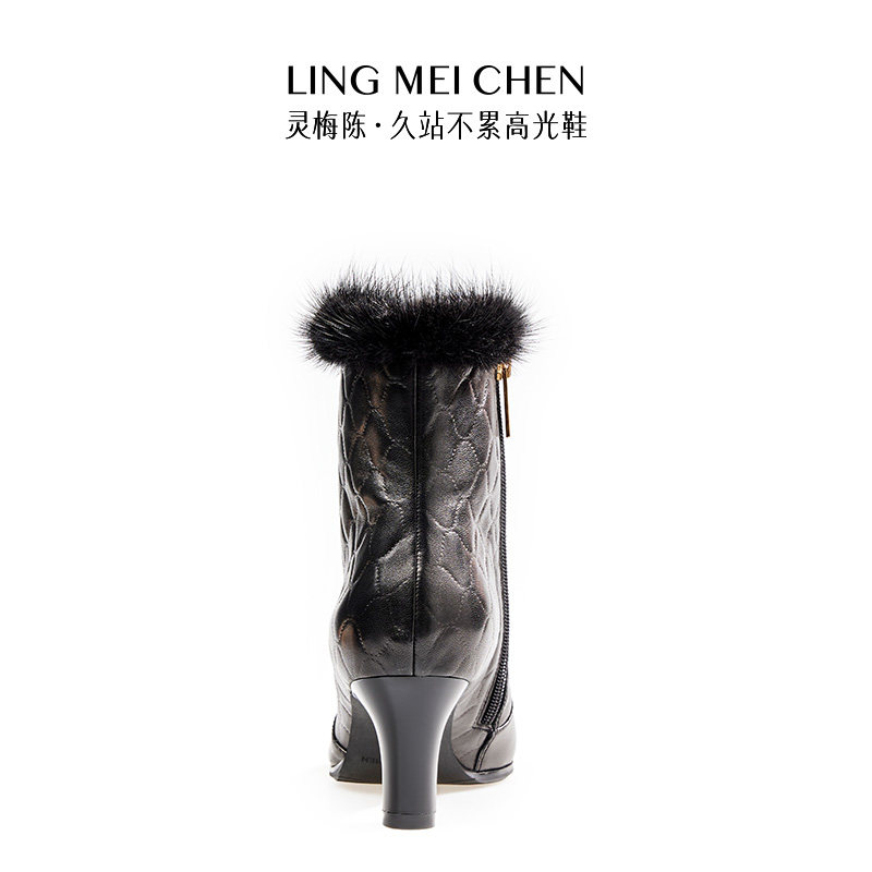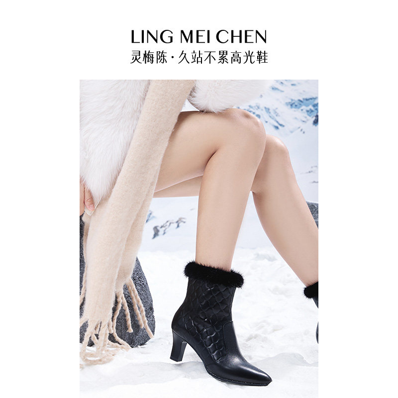 LINGMEICHEN尖头短靴新款女靴粗跟皮鞋女款冬季高跟鞋毛口真皮靴