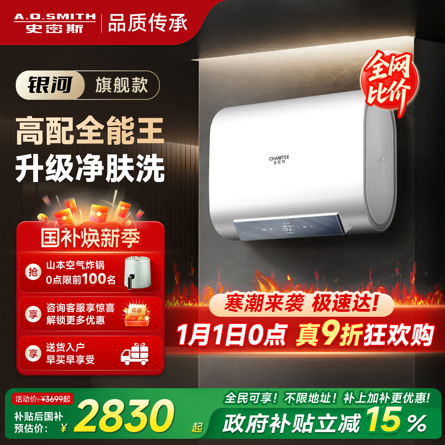 国补AO史密斯佳尼特银河电热水器60/80升HTS免清洗免换镁棒卫生间