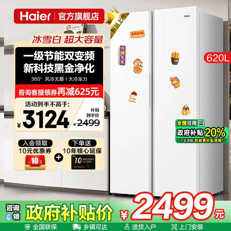 海尔电冰箱620L升白色对开门两双门一级能效家用大容量无霜旗舰店