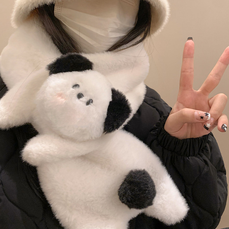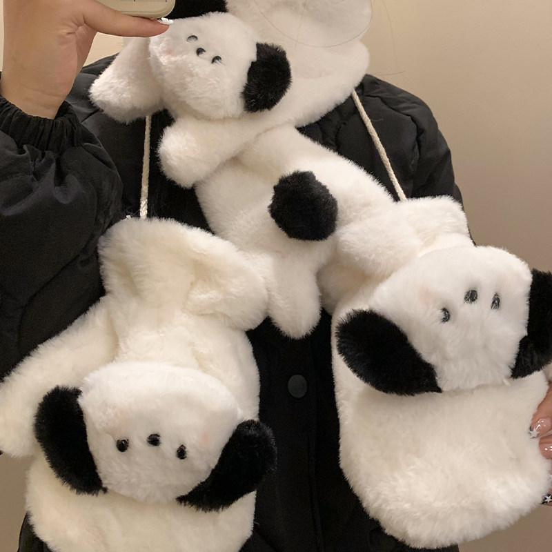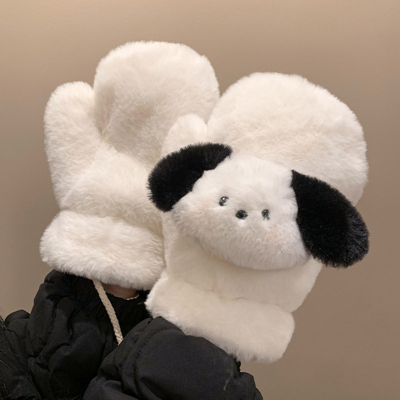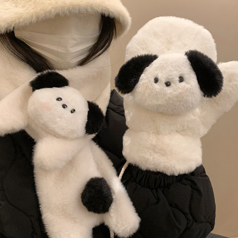 可爱小狗毛绒手套女秋冬季加厚保暖骑行学生挂脖全包连指防风防寒