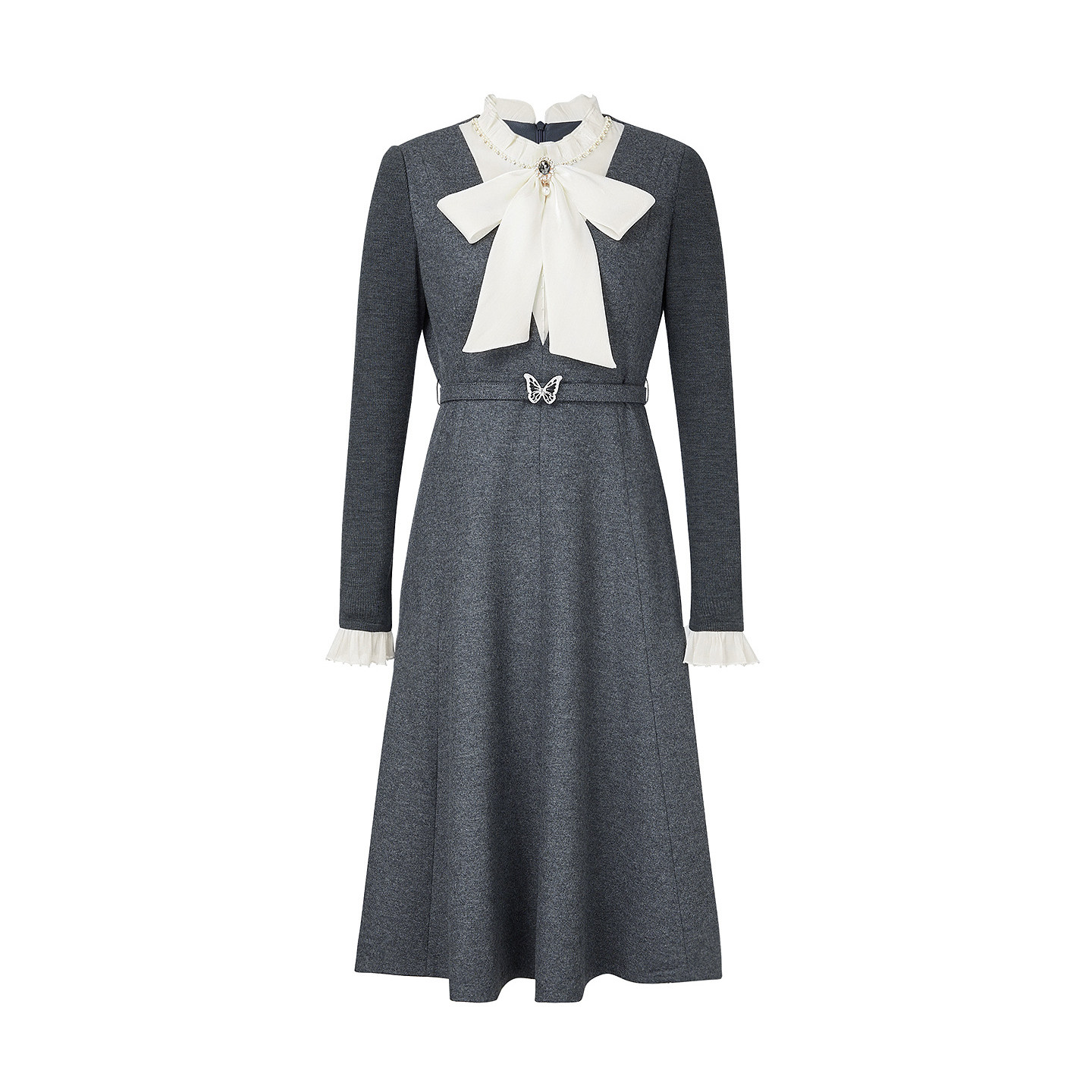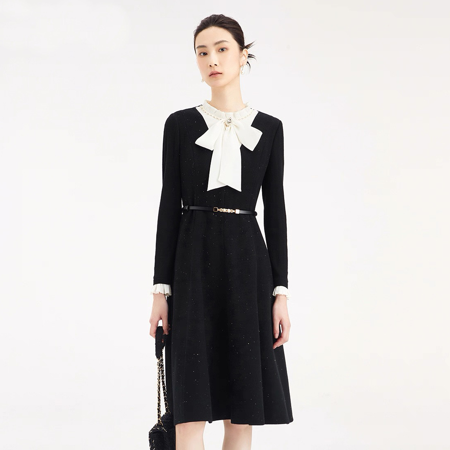 珂莱商场同款2025秋冬季新款女装优雅拼接飘带领长袖羊毛呢连衣裙