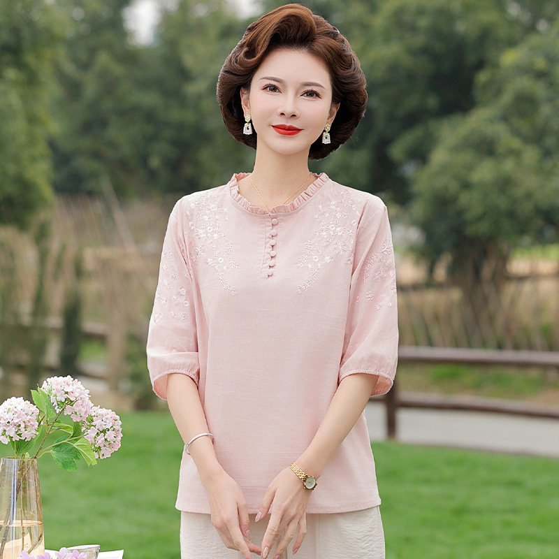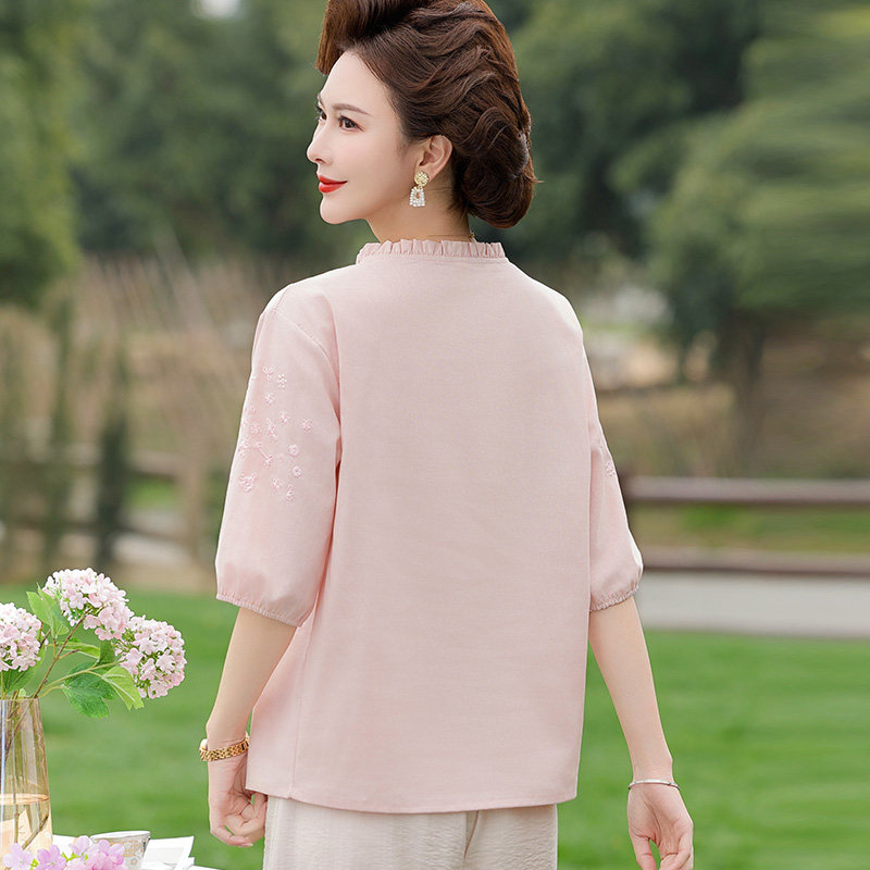 2025新款天丝棉麻套装中老年人女装夏季短袖衬衫妈妈夏装薄款外套