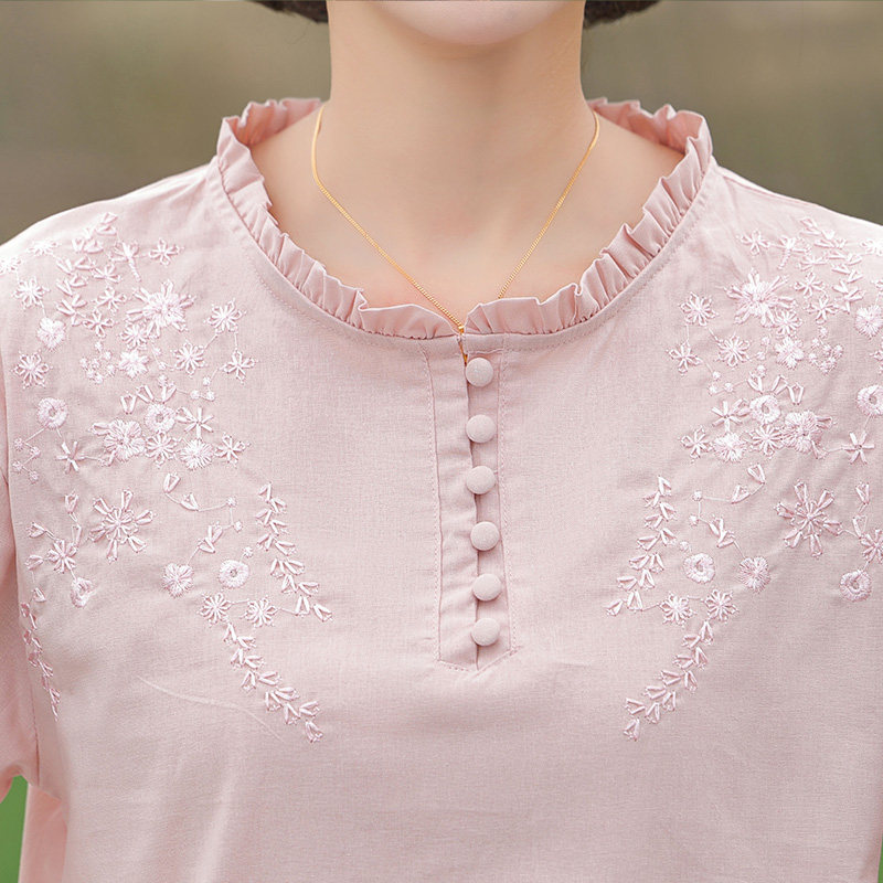 恒源祥时尚妈妈装小衫中老年女装圆领上衣洋气T恤民族风短袖刺绣