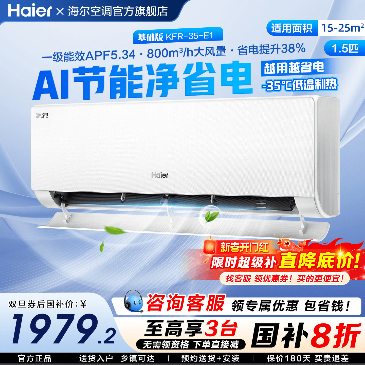 【国补8折】海尔空调1.5匹家用一级能效变频卧室挂机冷暖E1旗舰店