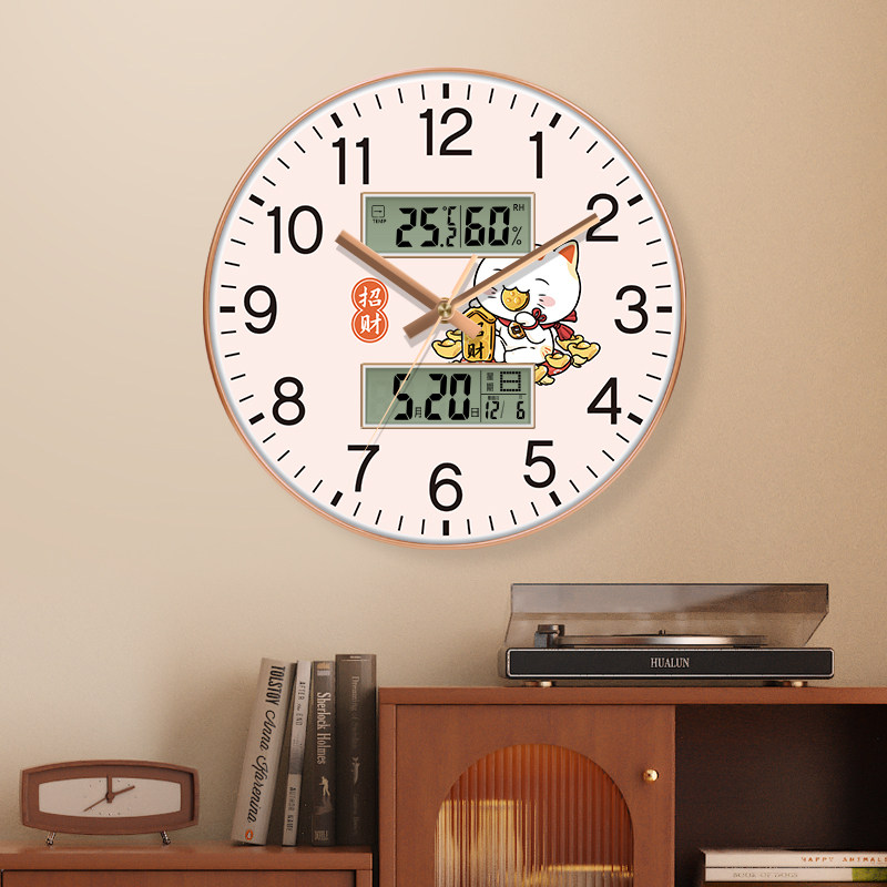 招财猫家用带温度日历静音挂钟客厅免打孔时钟自动对时卧室大气