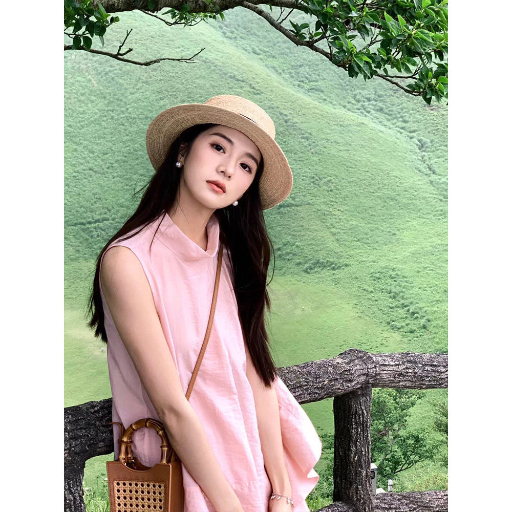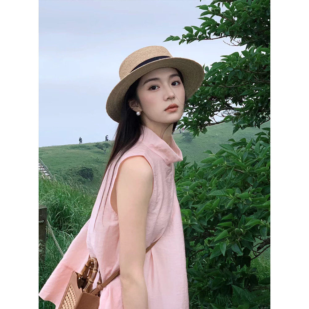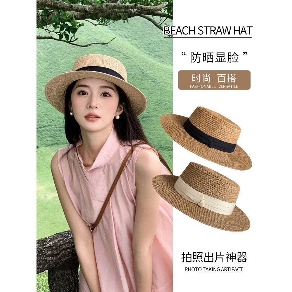 目丸新款法式平顶草帽女大头围海边沙滩礼帽编织防晒太阳帽子夏季