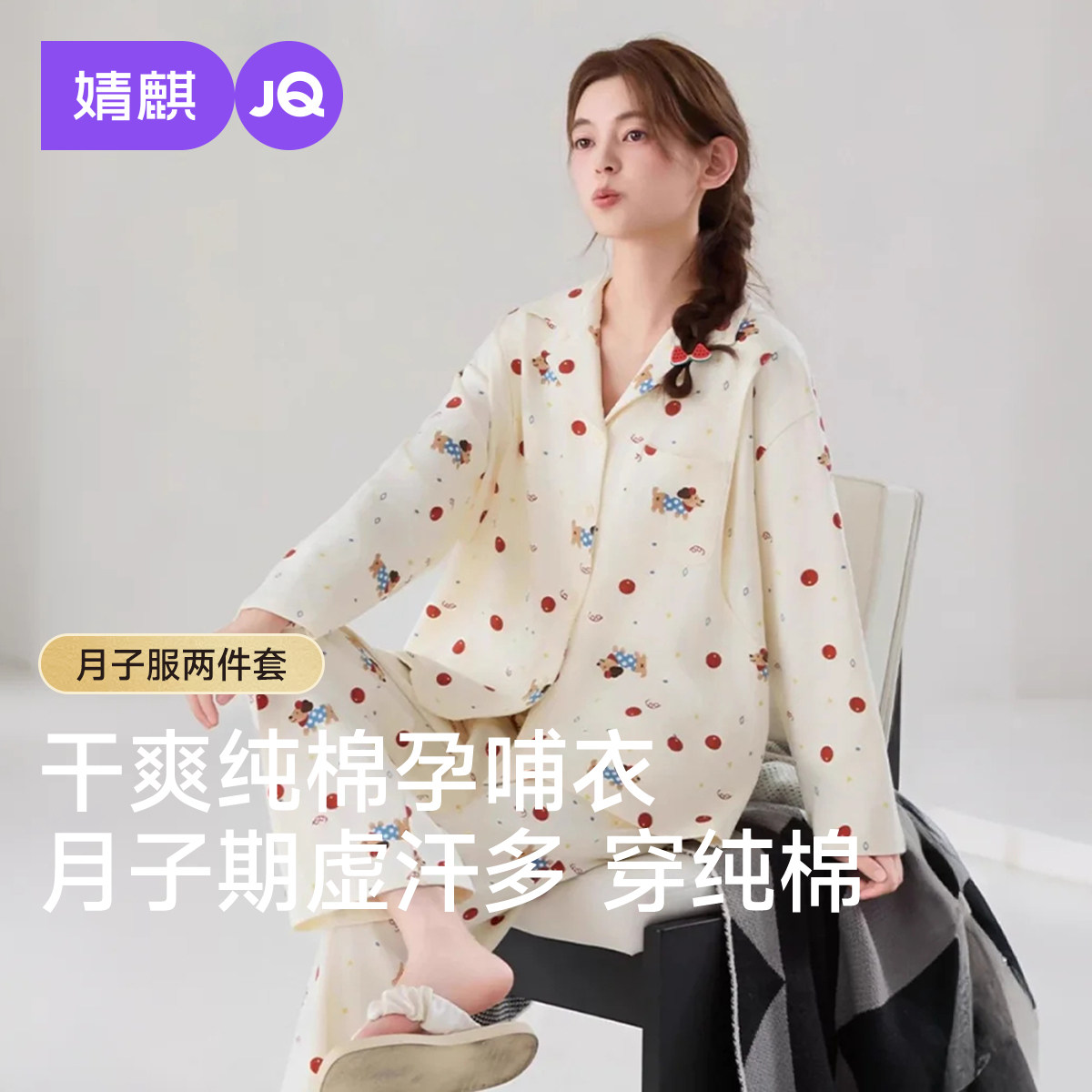 婧麒月子服纯棉吸汗秋冬季睡衣孕妇产后哺乳喂奶保暖家居服套装女