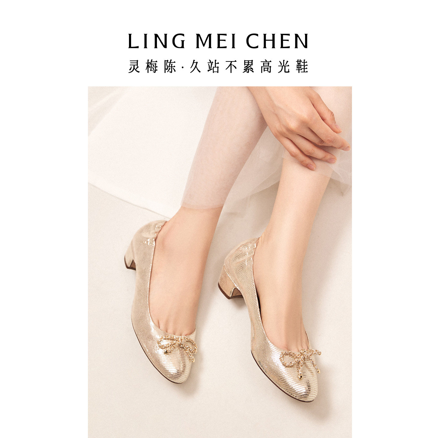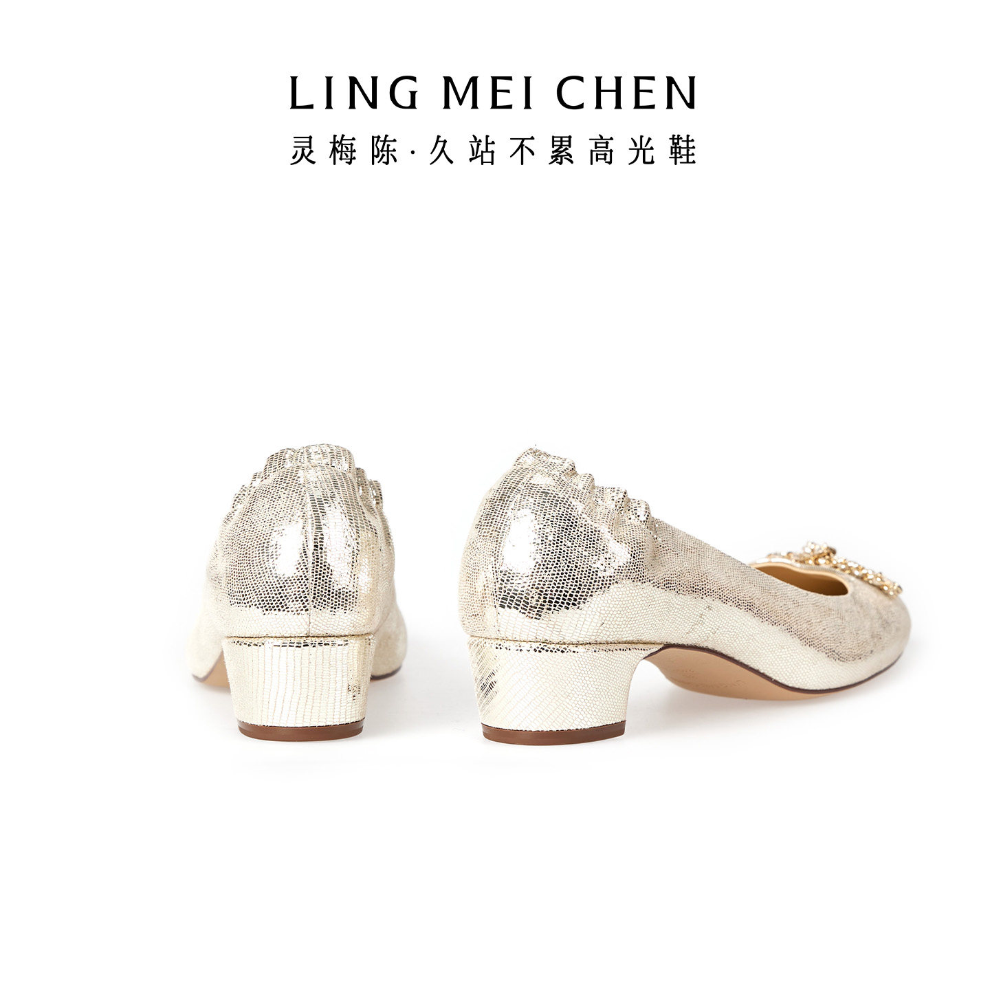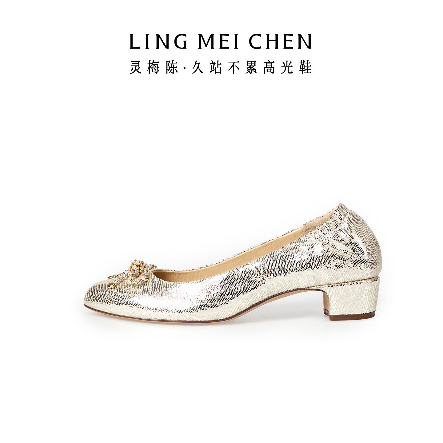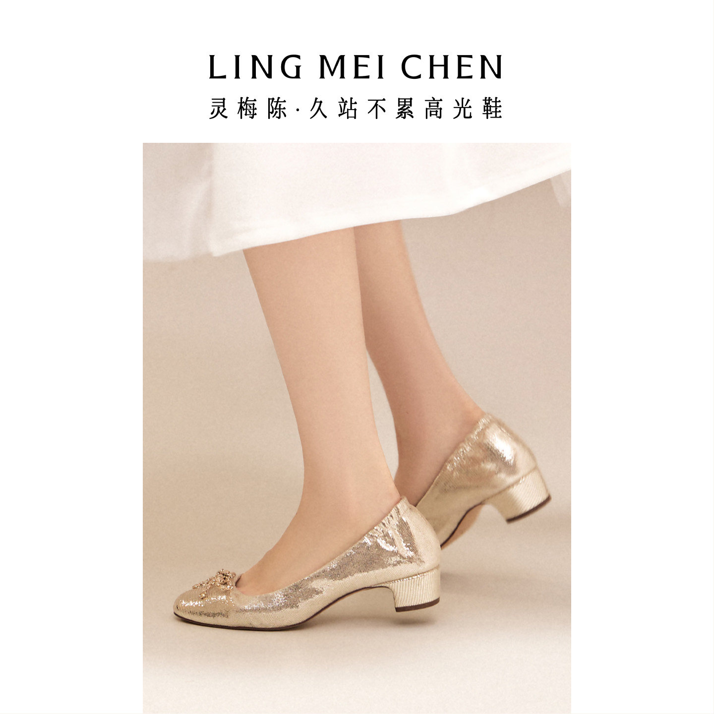 LINGMEICHEN芭蕾高跟鞋羊皮粗跟蛋卷鞋金色真皮单鞋圆头平底鞋女