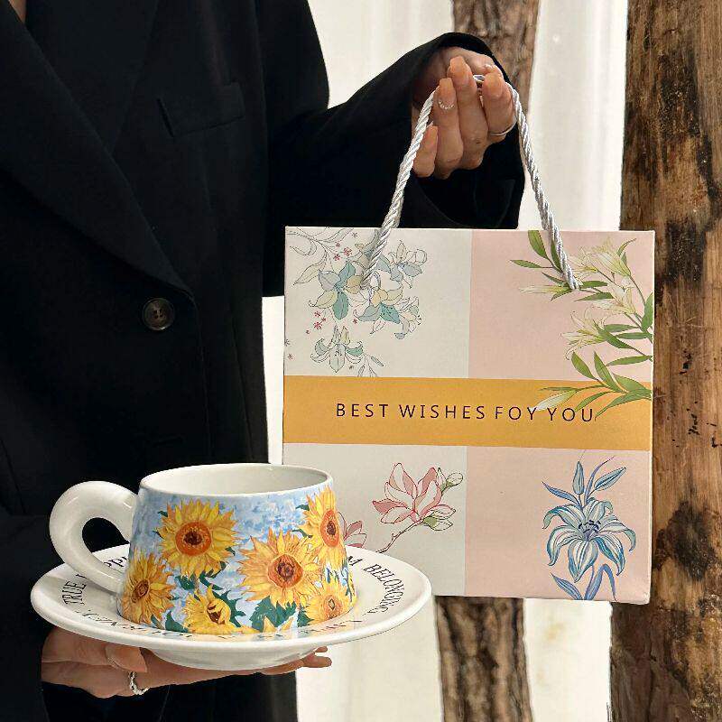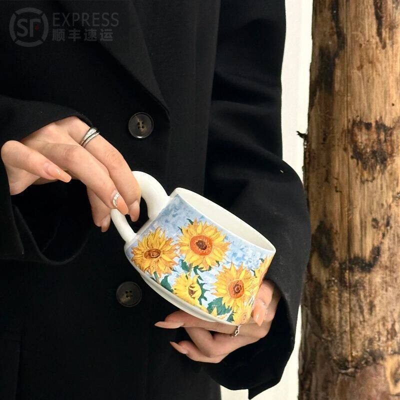 复古小众向日葵咖啡杯碟套装下午茶拿铁陶瓷马克杯伴手礼生日礼物