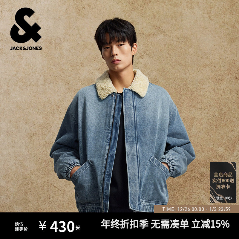 杰克琼斯棉服男款秋冬水洗牛仔夹克美式仿羊羔毛翻领棉衣外套男装