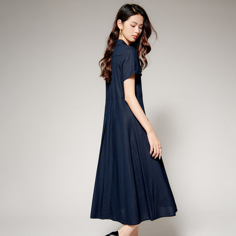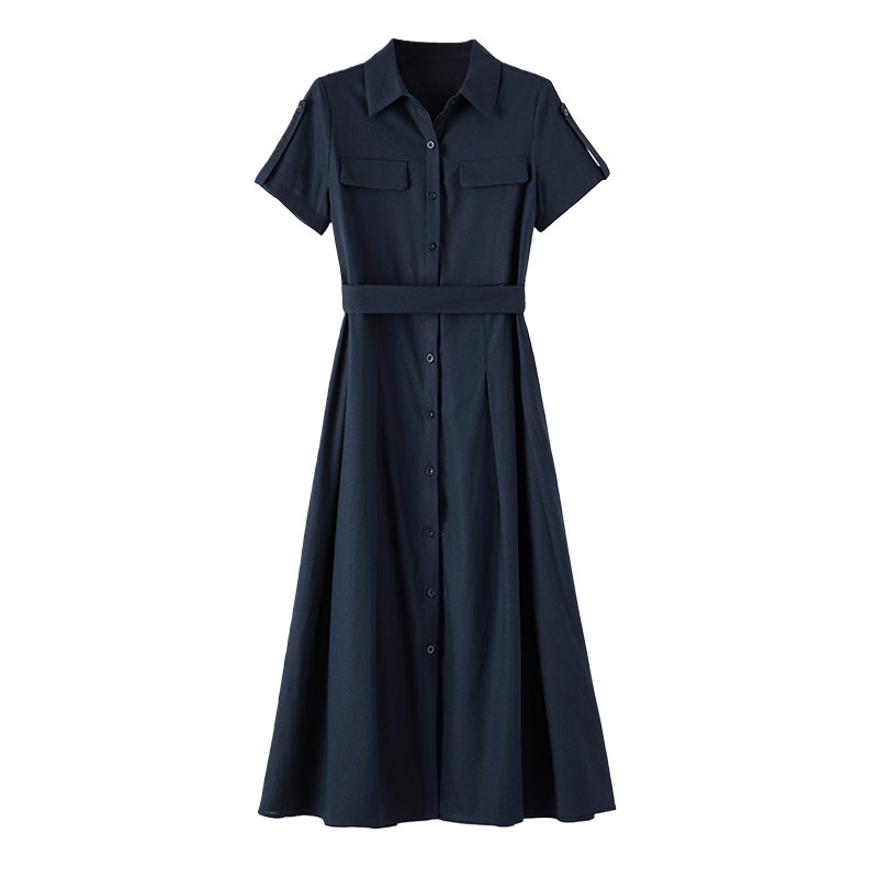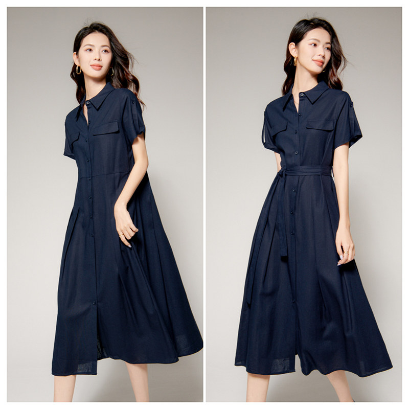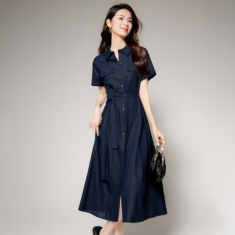 晚白2026年春新款经典翻领棉麻裙子系带收腰干练通勤短袖连衣裙