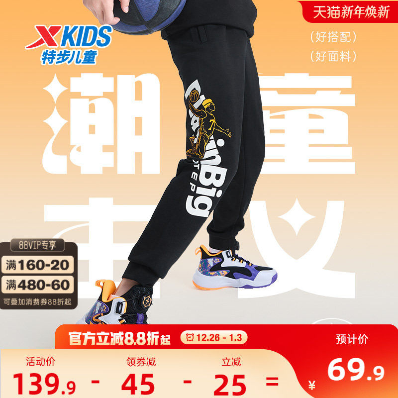 特步童装男童印花裤子儿童长裤2025秋冬款大童加绒运动裤冬装卫裤
