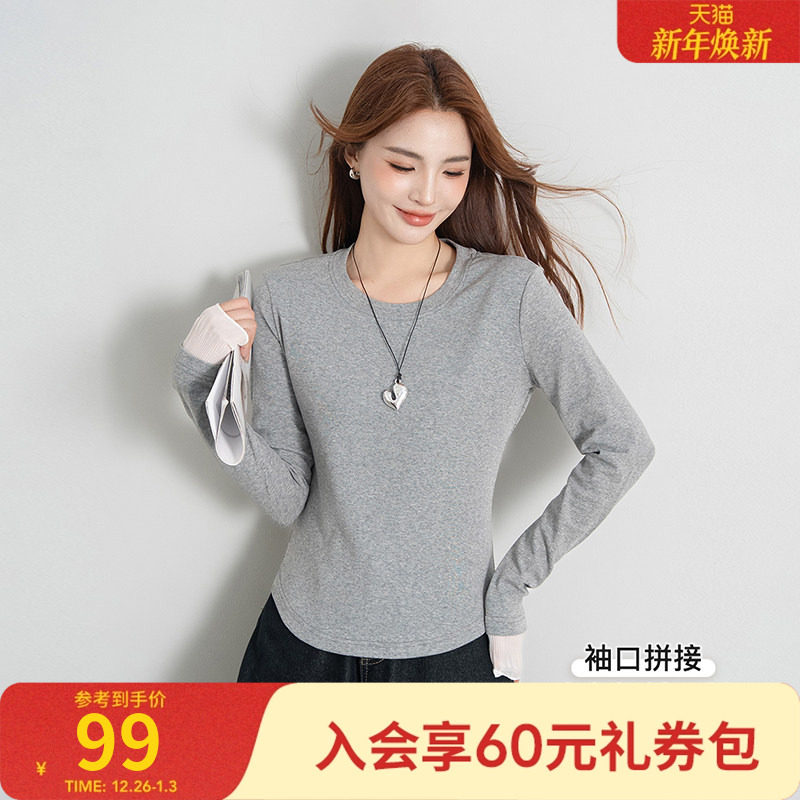 三福长袖上衣女2025新款秋冬季圆领内搭打底衫修身白色t恤女装