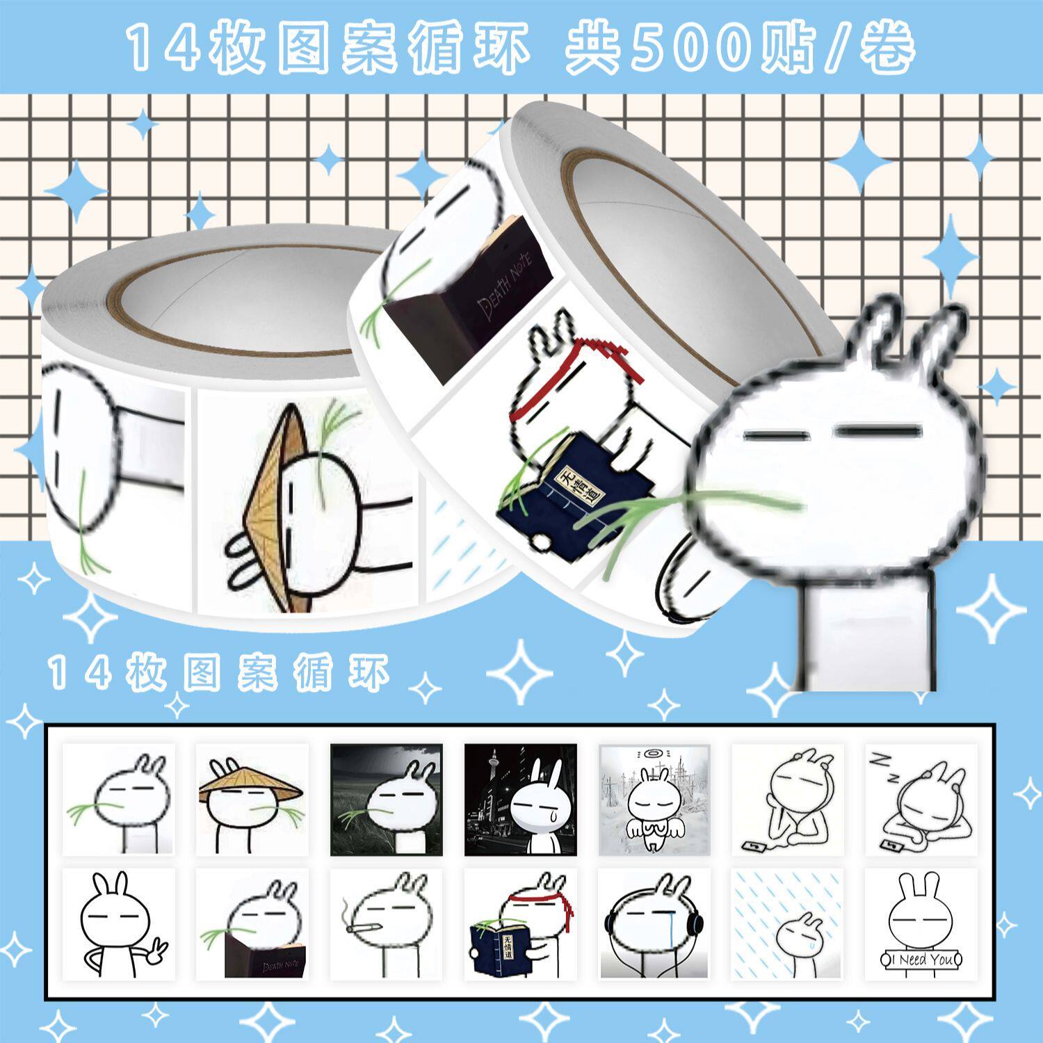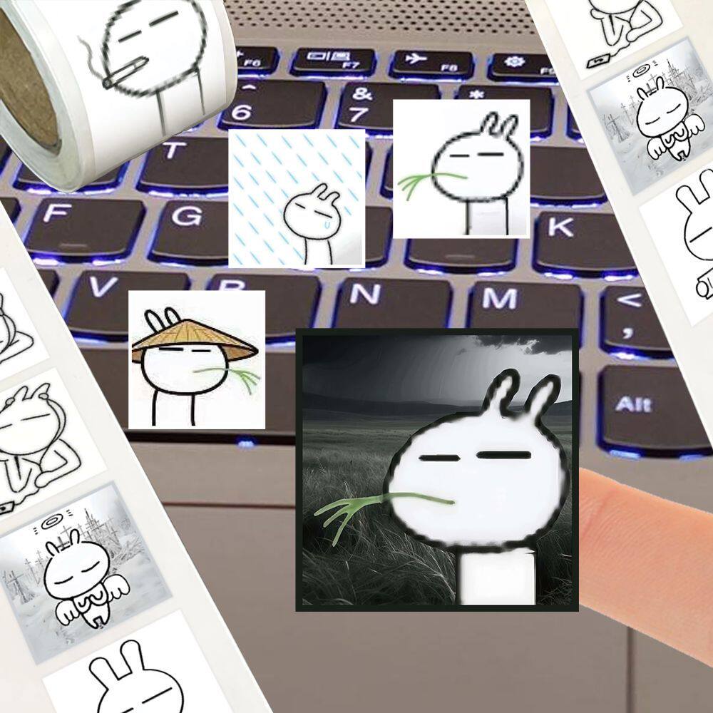 爆款500贴兔斯基忧郁头像卷卷贴热门古早萌物简笔画兔子手账贴画